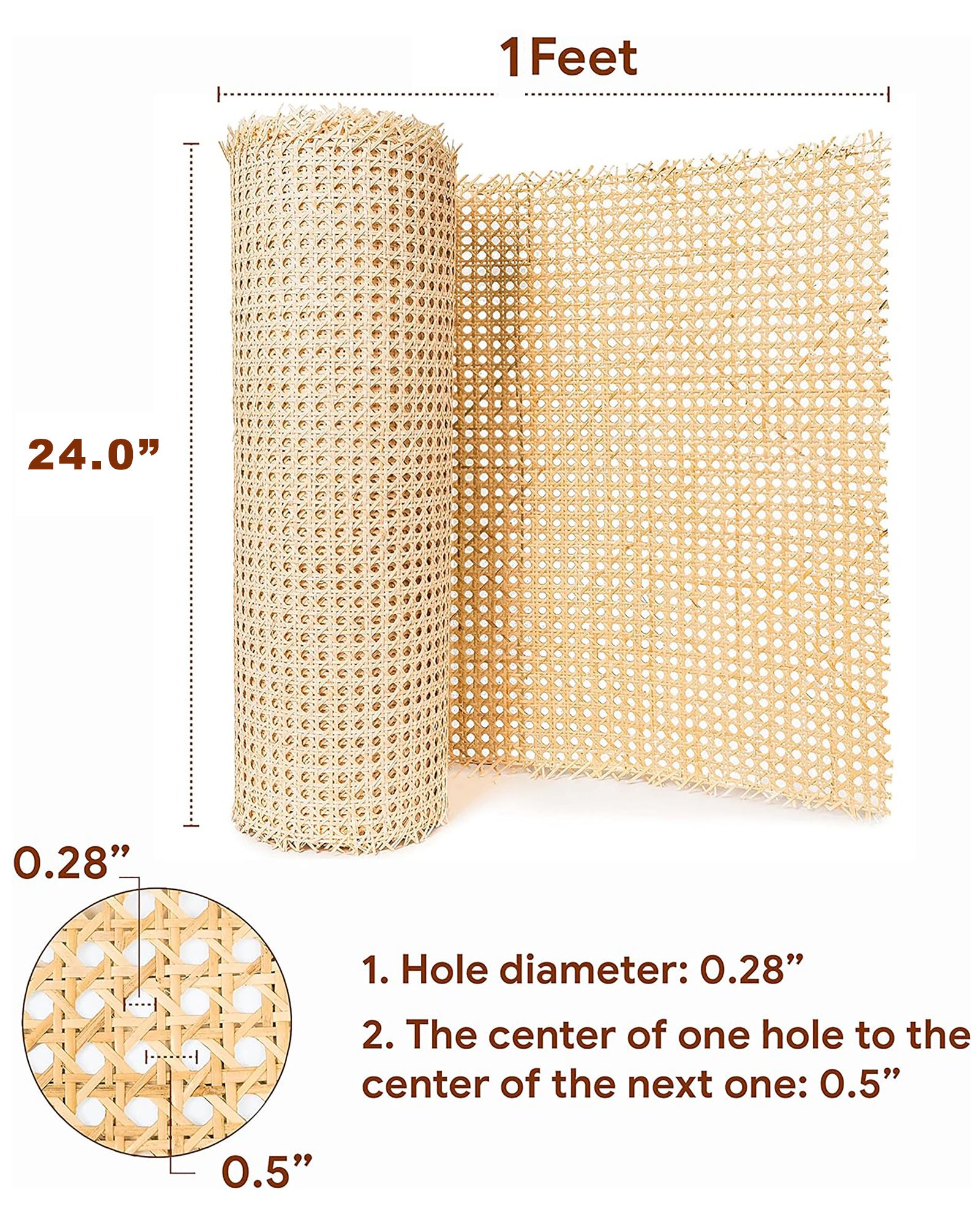 24" Width Cane Webbing 1 Feet, Natural Rattan Webbing for Caning Projects, Woven Open Mesh Cane for Furniture, Chair, Cabinet, Ceiling