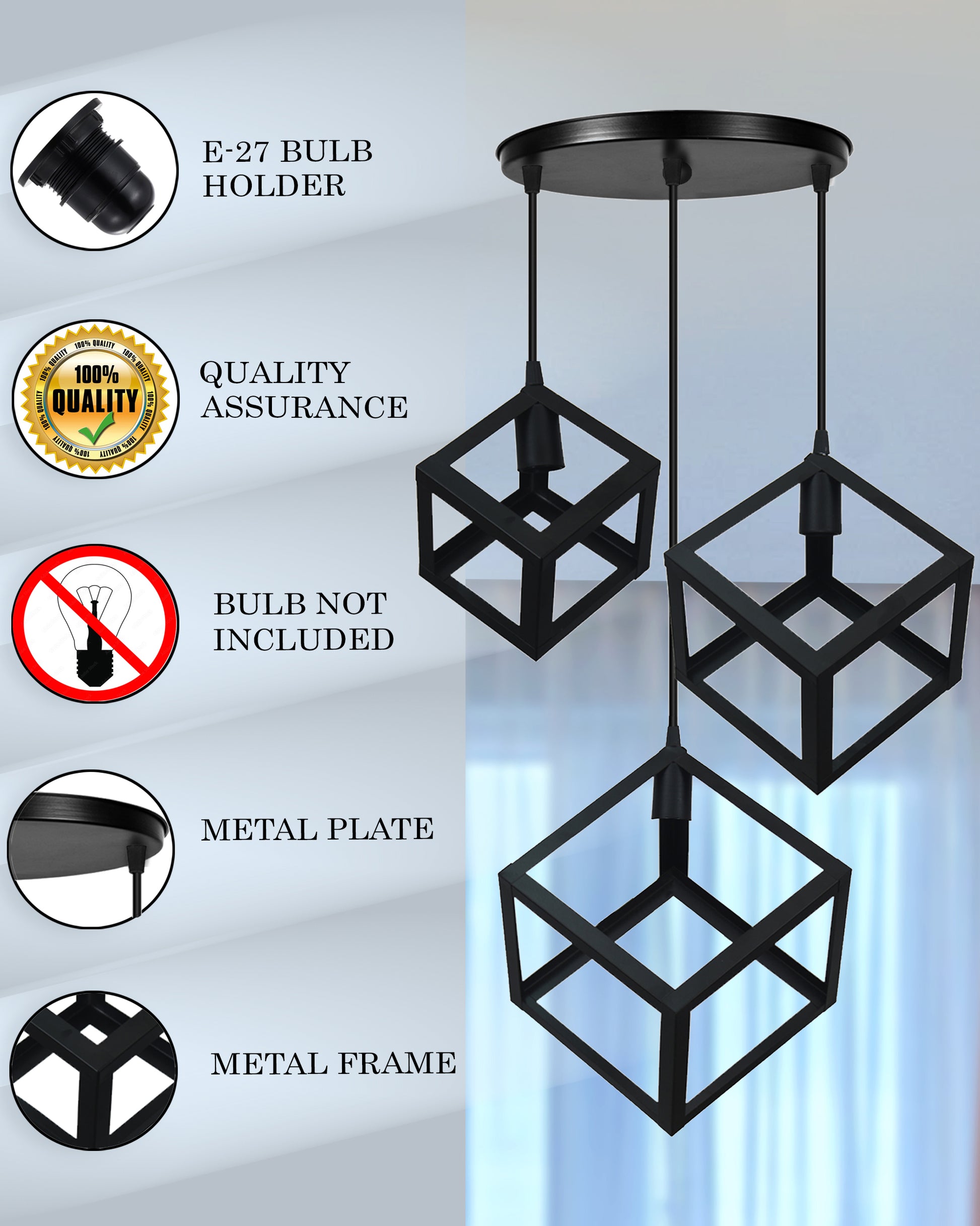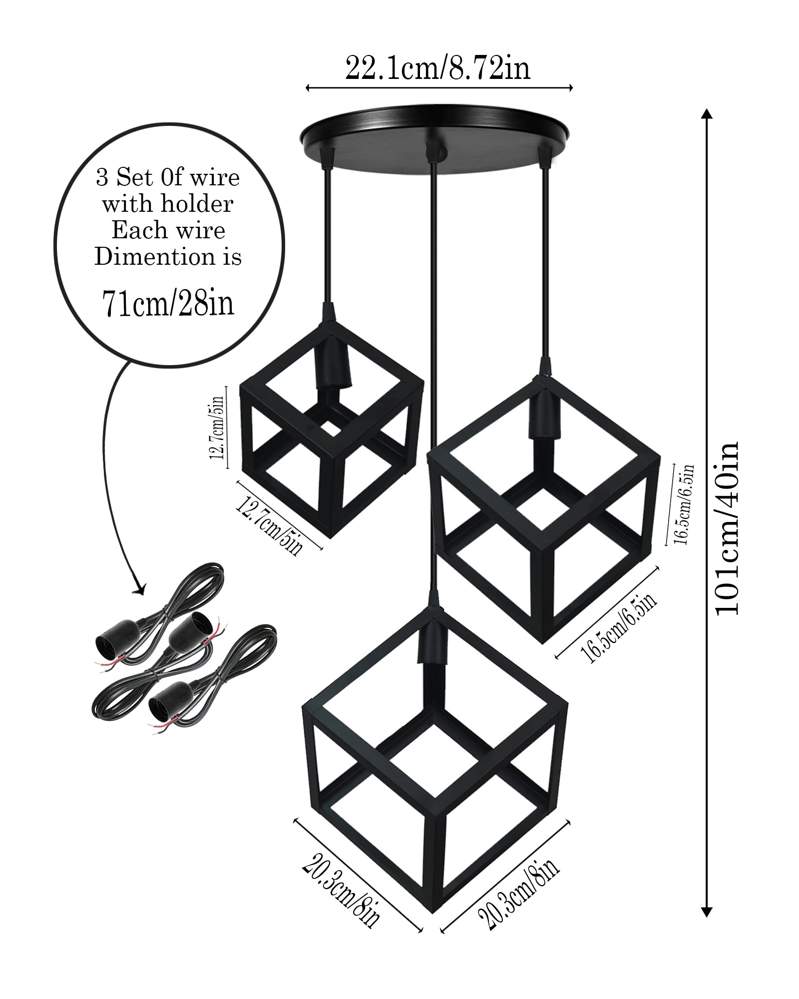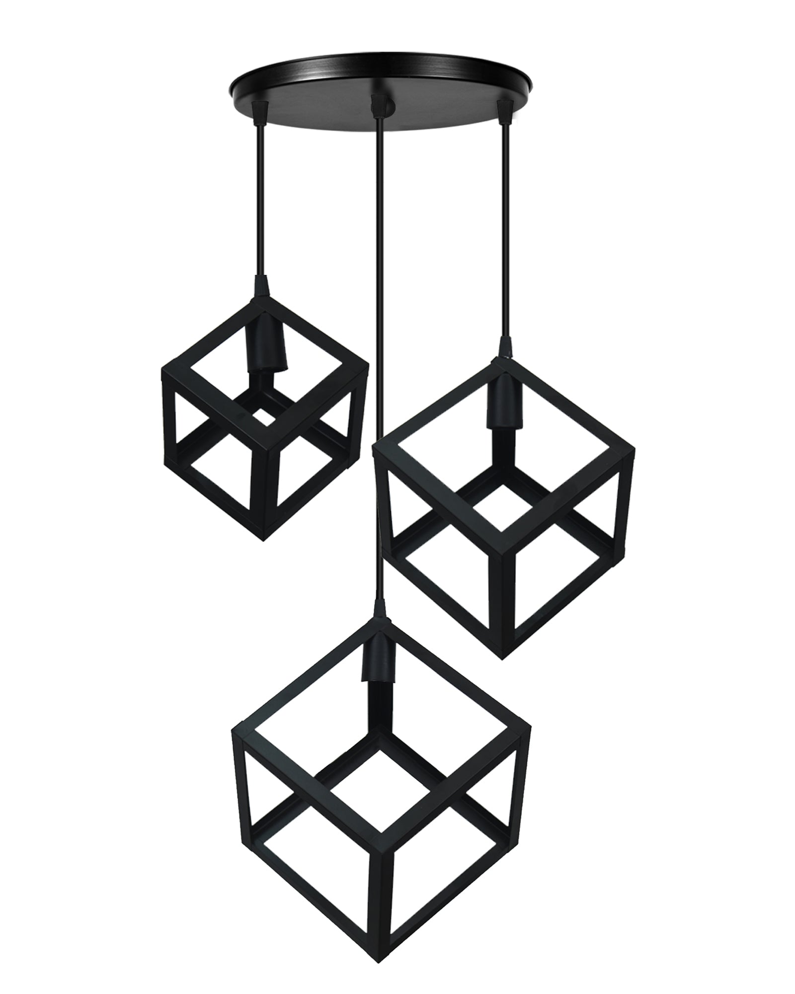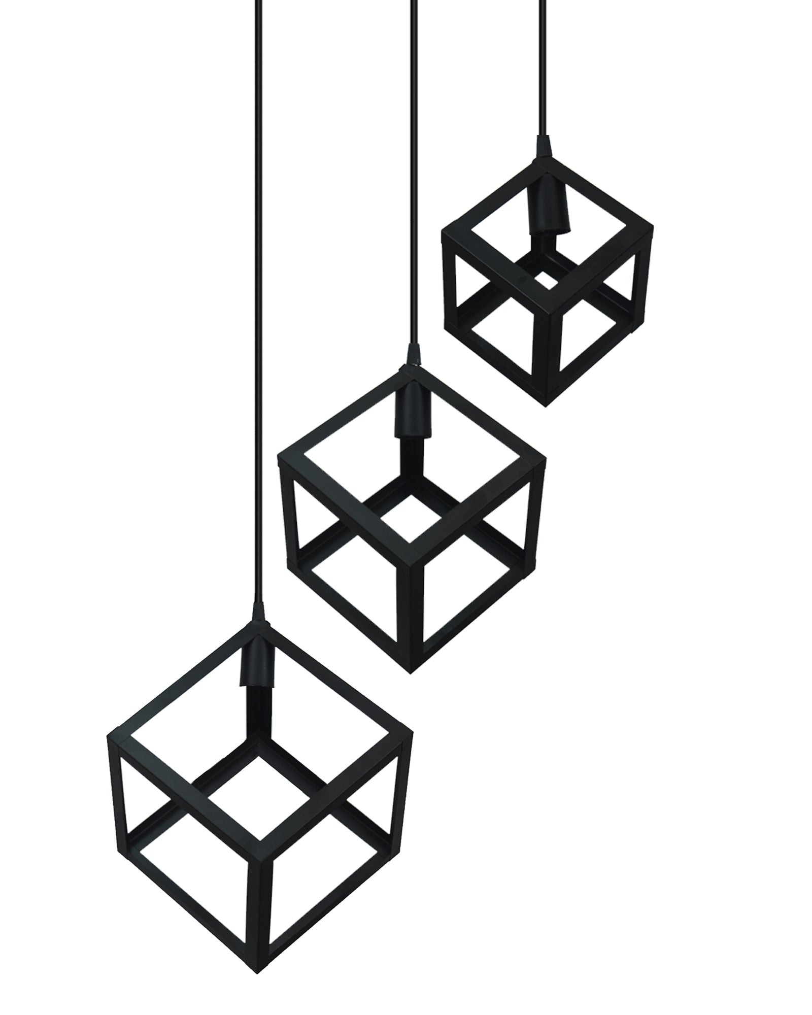 Elevate your living space with this striking hanging lamp, a stunning example of modern hanging lamps combined with industrial flair. Crafted with a sleek, geometric design, it features three intricately patterned cubes suspended from a circular canopy. The matte black finish lends a sophisticated touch, blending seamlessly with both industrial hanging lamps and minimalist aesthetics. With its eye-catching silhouette and adjustable wire lengths (71cm/28in each), this pendant light creates a captivating focal point while providing ample illumination, Measuring 22.1cm/8.72in wide and 101.4cm/40in tall, this fixture is perfect for vintage hanging lamps enthusiasts seeking a modern twist or those who appreciate the clean lines of a minimalist hanging light. It’s ideal for adorning entryways, dining areas, or living rooms, offering a timeless blend of form and function. With two power cords included for easy installation, this geometric hanging lamp embraces the balance between elegance and architectural design, making it a versatile addition to spaces craving a touch of modern sophistication.