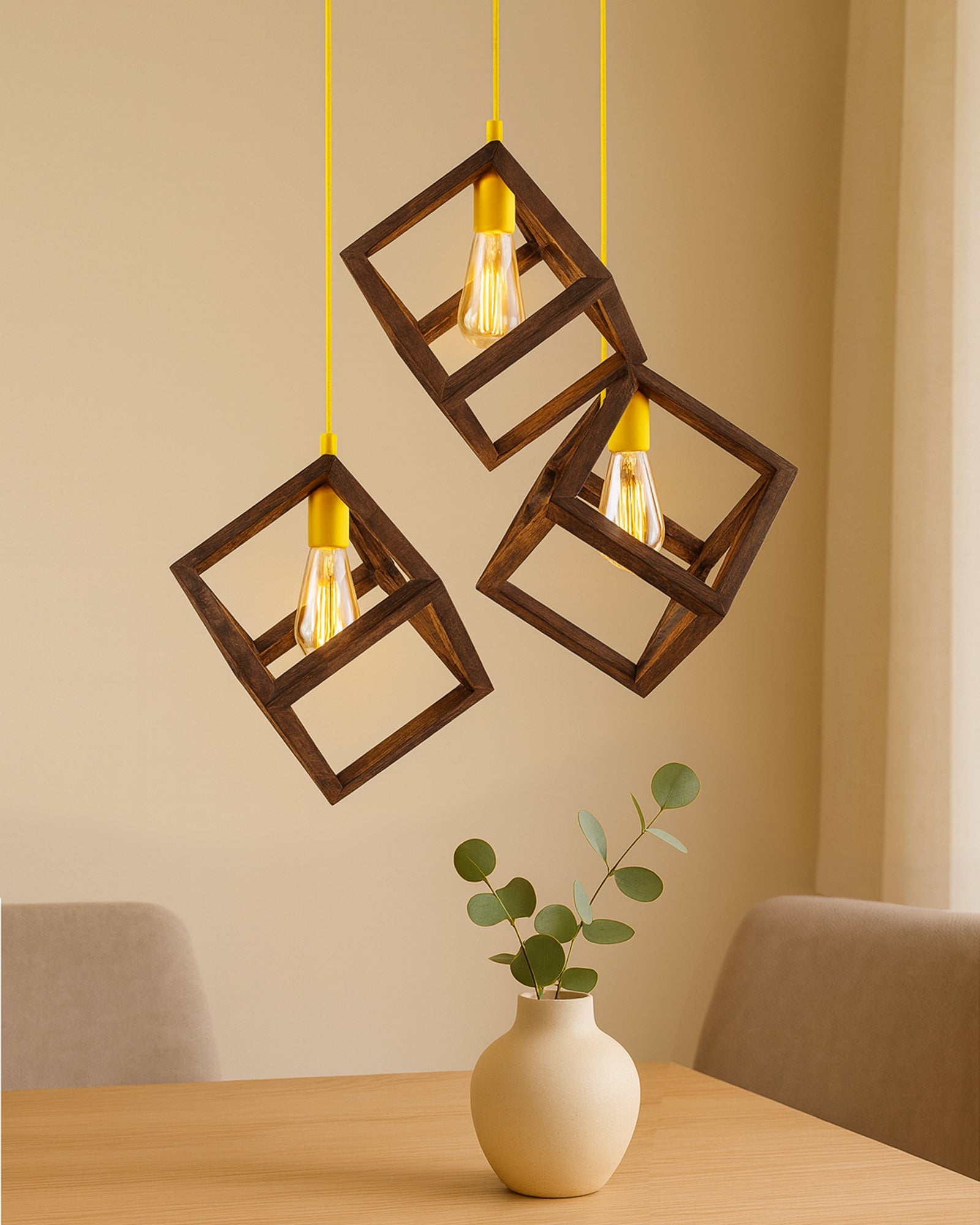 • CLASSIC DESIGN: Illuminate your dining room or living room with this striking cluster pendant features three graduated Walnut colour Cube shaped shade lights suspended from a round plate on black-finished rods artfully displayed at different heights.