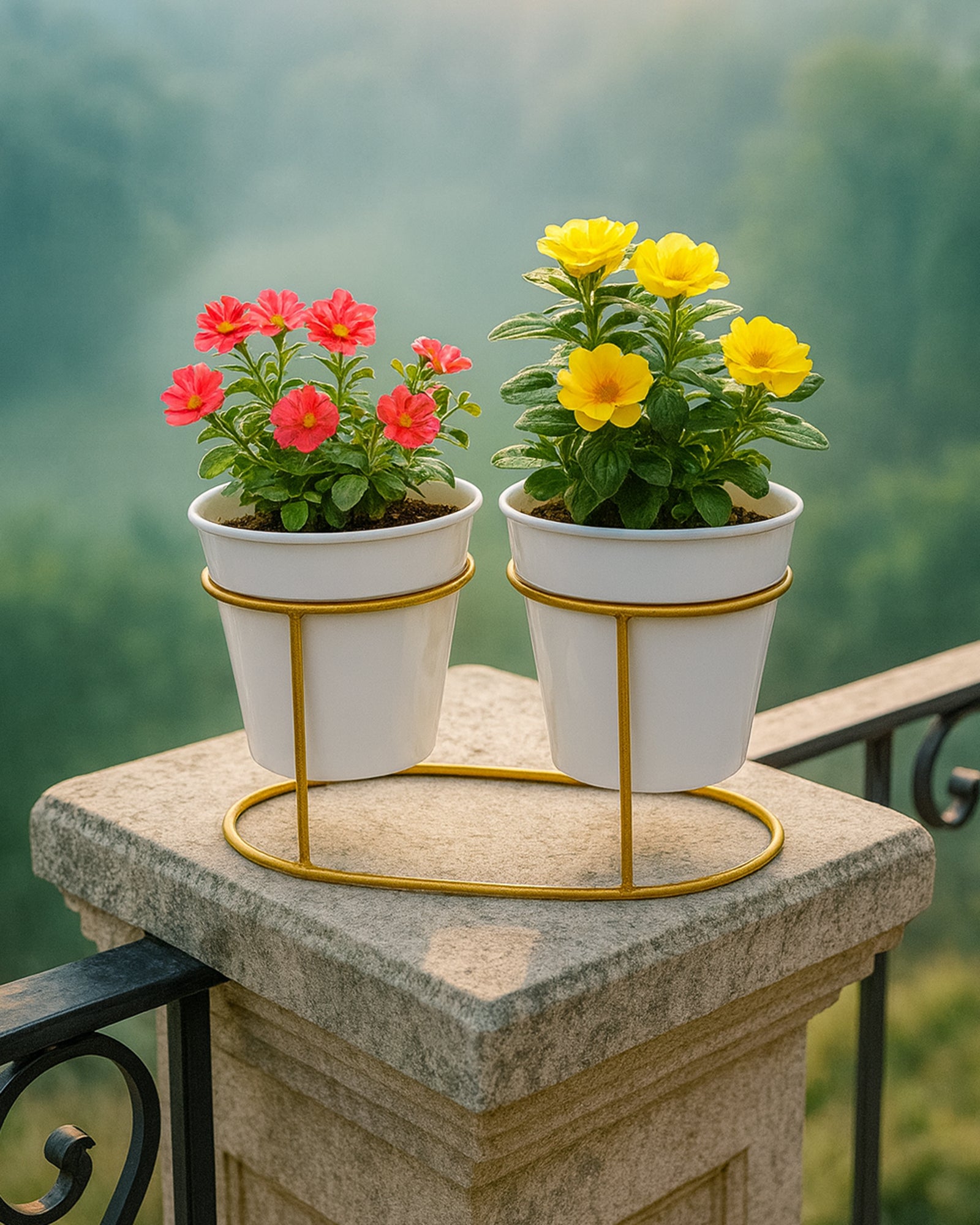Combo of 2 Table Top Designer Metallic Gold Metal Stand with Planters, Small White Metal Pots for Livingroom, Balcony & Home Decoration, Twin Oval Planter