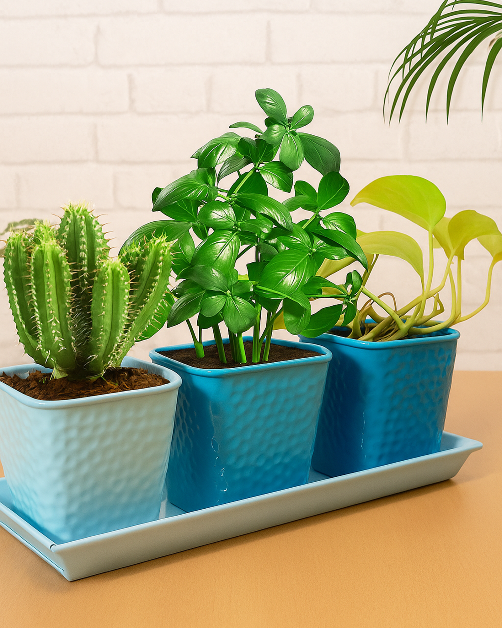 Herb Pot Planter Set with Tray for Indoor Garden or Outdoor Use,Metal Succulent Potted Planters for Kitchen, (Set of 3, 4.25” x 4” Planters on 12.5” x 4" Tray)