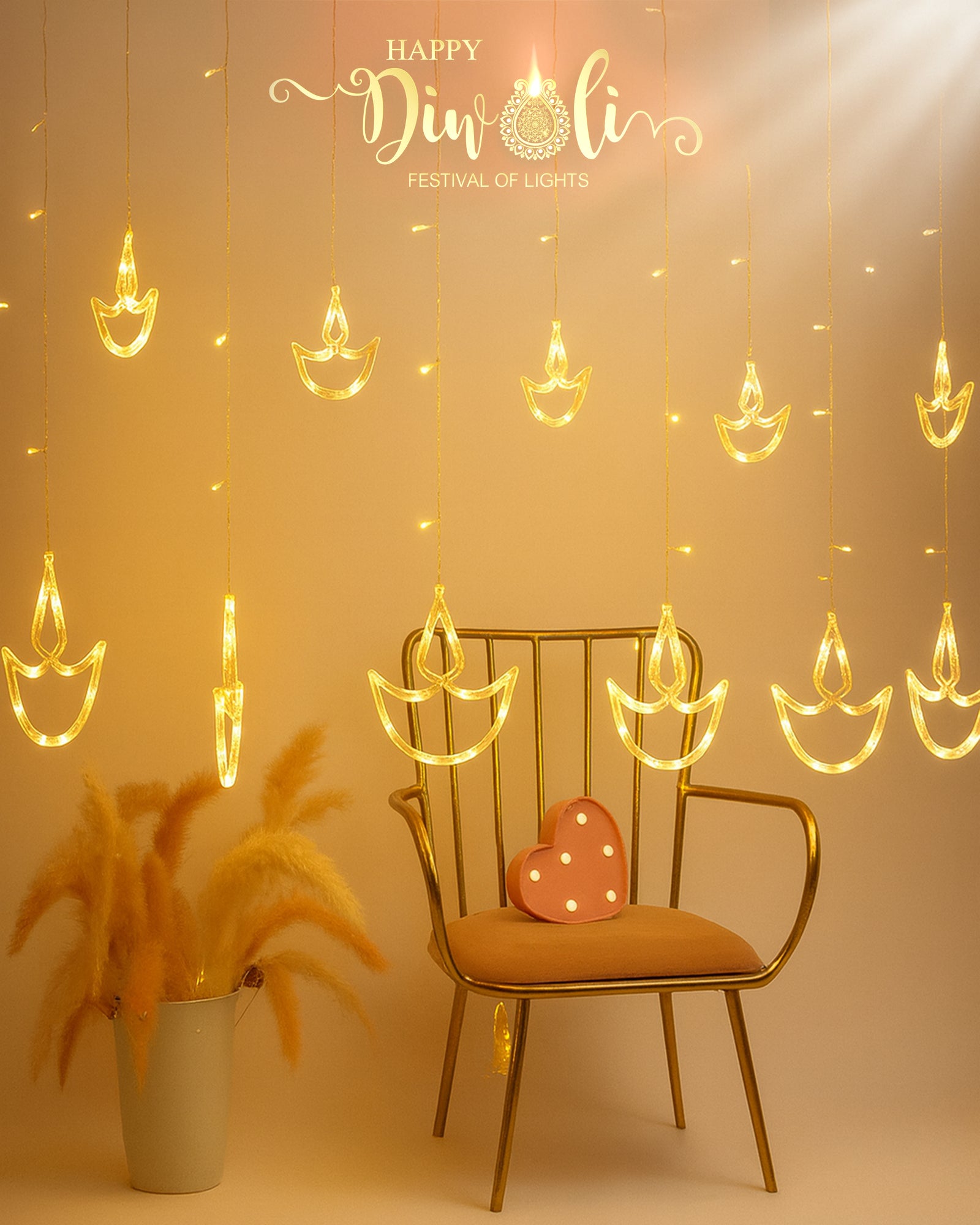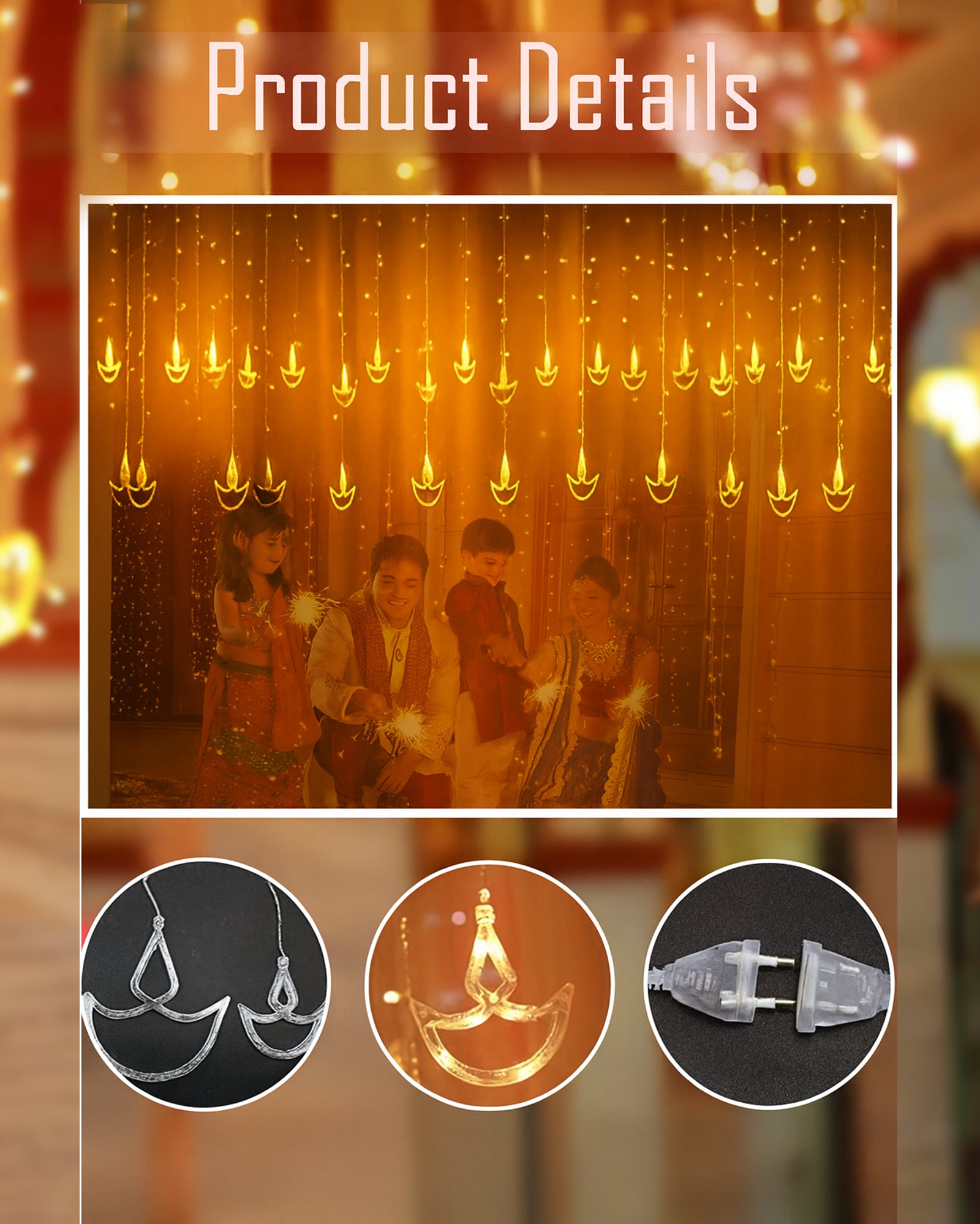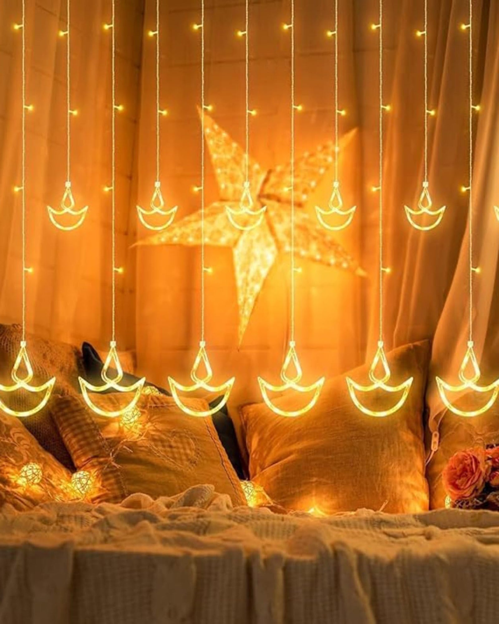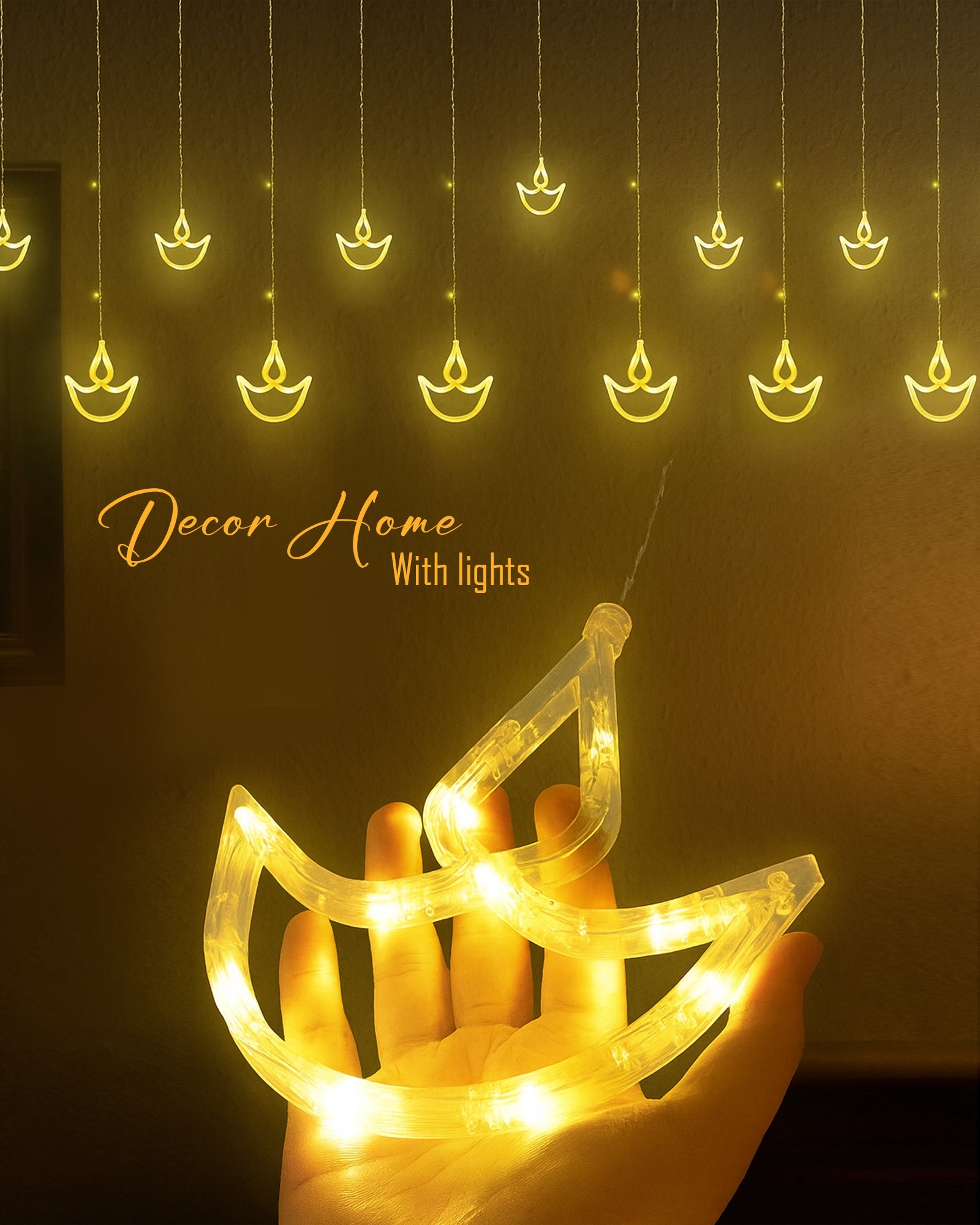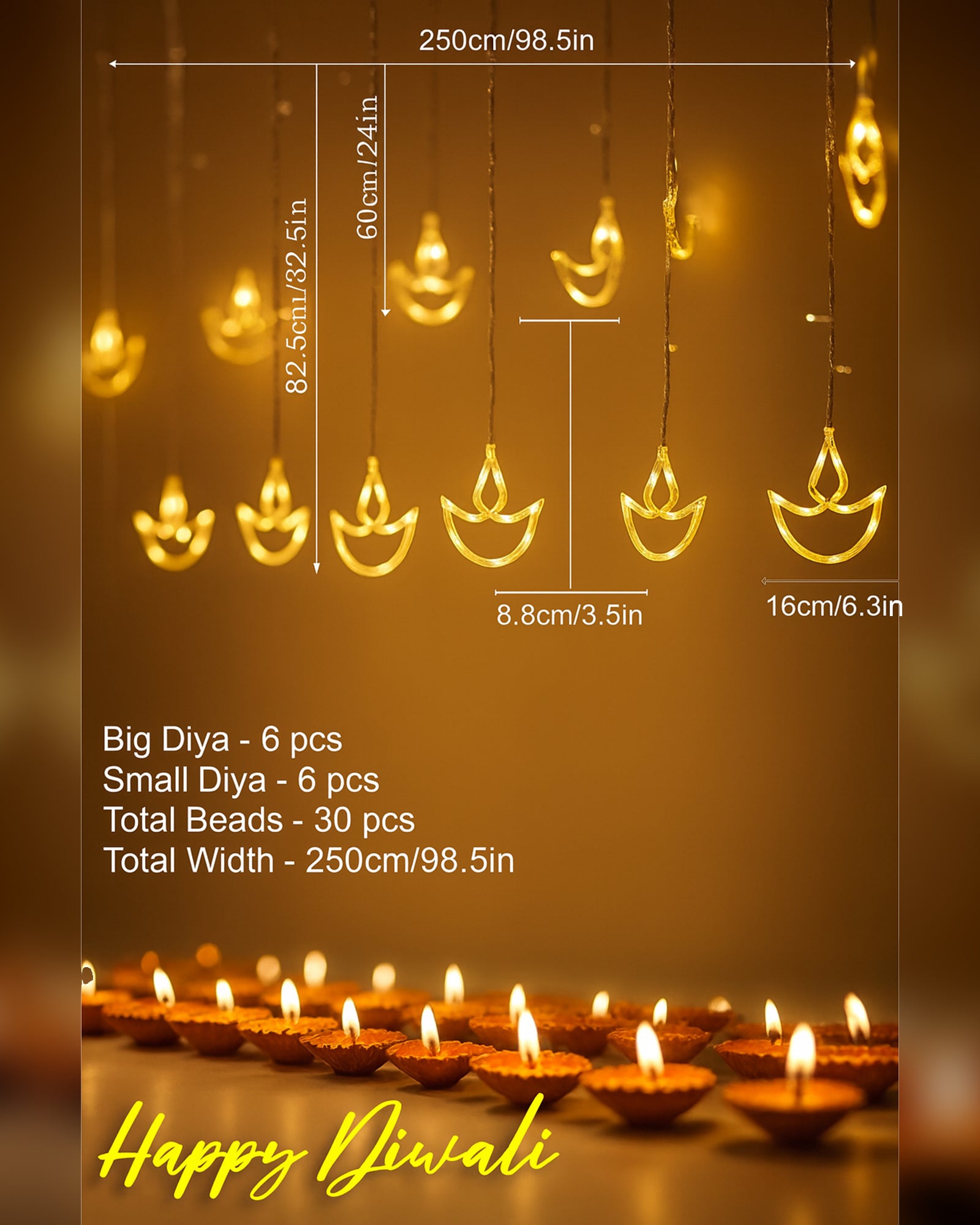 Bring a warm festive glow to your home with these beautiful LED Diya String Lights. Designed with delicate diya shapes, each light emits a soft golden illumination, creating a serene and celebratory atmosphere. Perfect for Diwali, weddings, pooja rooms, balconies, living rooms, and festive décor, these lights instantly transform any space into a welcoming haven. Crafted with meticulous attention to detail, these delightful lights will add a warm, inviting ambiance to any room. Perfect for holidays, special occasions, or simply to infuse your home with a touch of whimsy. Diwali Diya Curtain Lights – 12 Warm White Diyas with Happy Diwali Sign, Indian Festival String Lights for Indoor Outdoor Wall, Window, Balcony decorations, With their soft, twinkling glow, these lights will create a captivating atmosphere that delights and soothes. Embrace the magic and elevate your decor with this charming lighting solution.