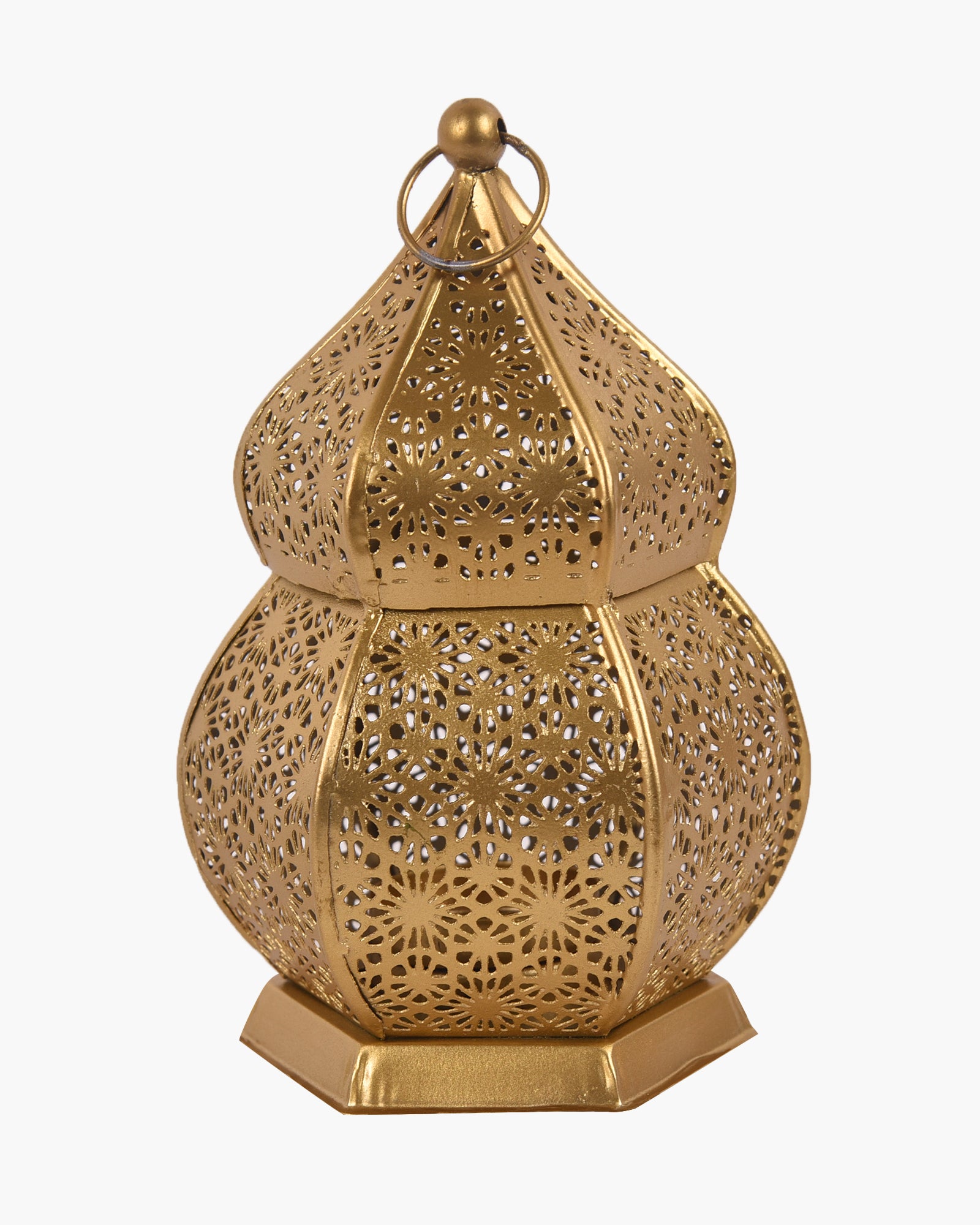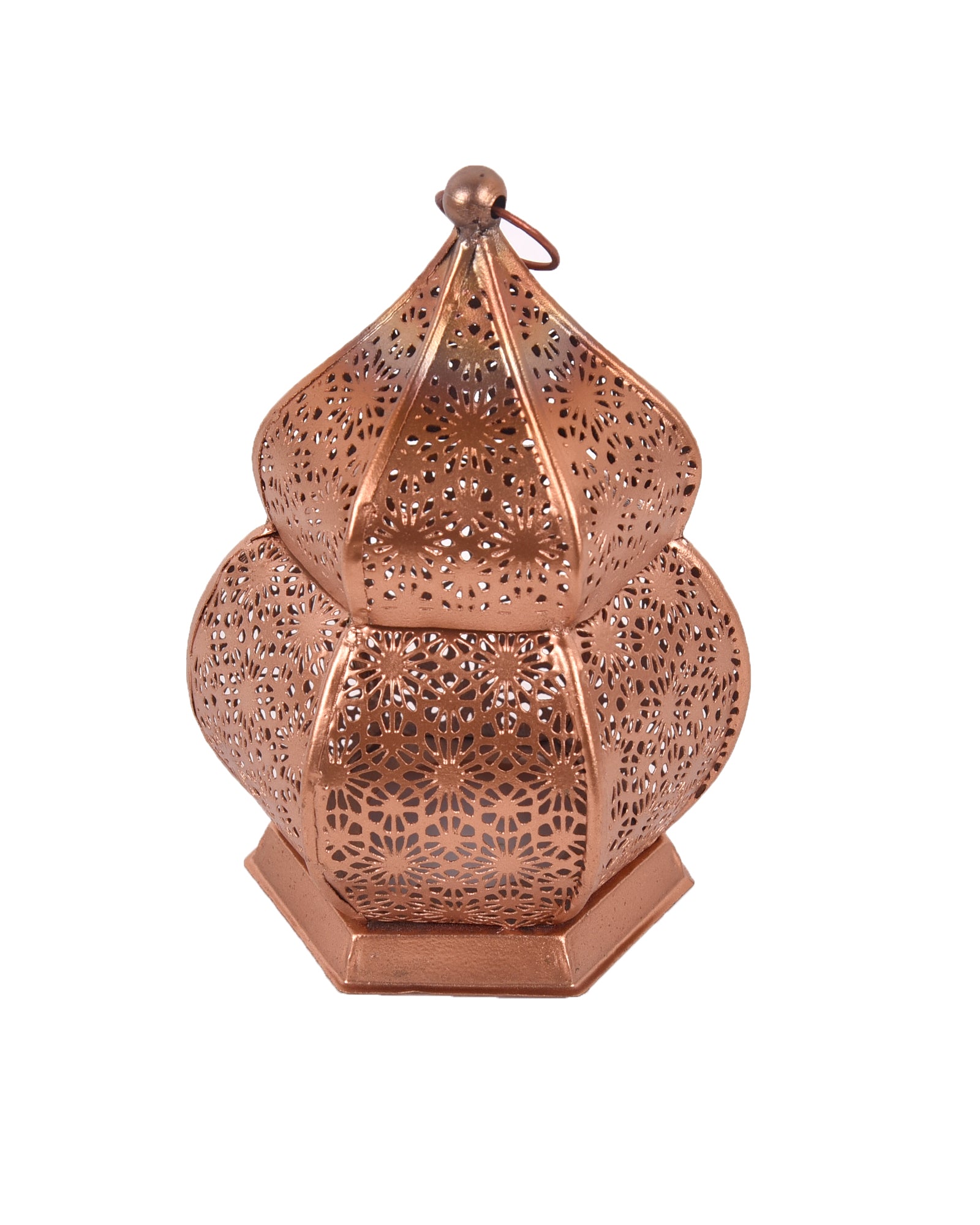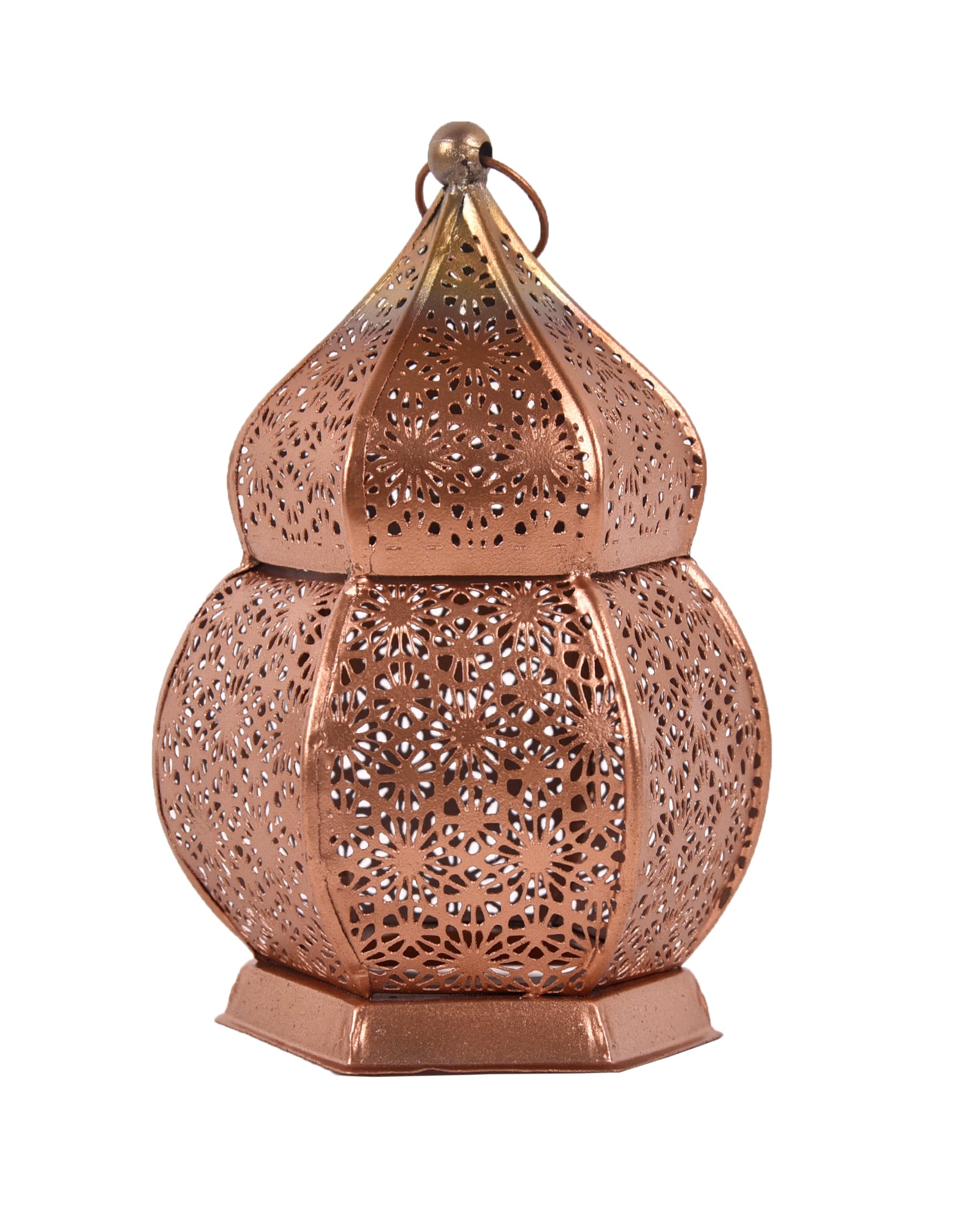 Add warmth to your space with this vintage-style Moroccan candle lantern, crafted from durable metal in a copper finish. Standing 16.5 cm tall and 9 cm wide, it features intricate floral cutouts that cast magical shadows when lit. The hexagonal base ensures stability on tables, while the decorative ring allows easy hanging. Ideal for both indoor and covered outdoor use, this compact candle lantern brings a cozy, ambient glow to living rooms, patios, or dining areas. Blend traditional Moroccan charm with modern elegance in any décor setting.
