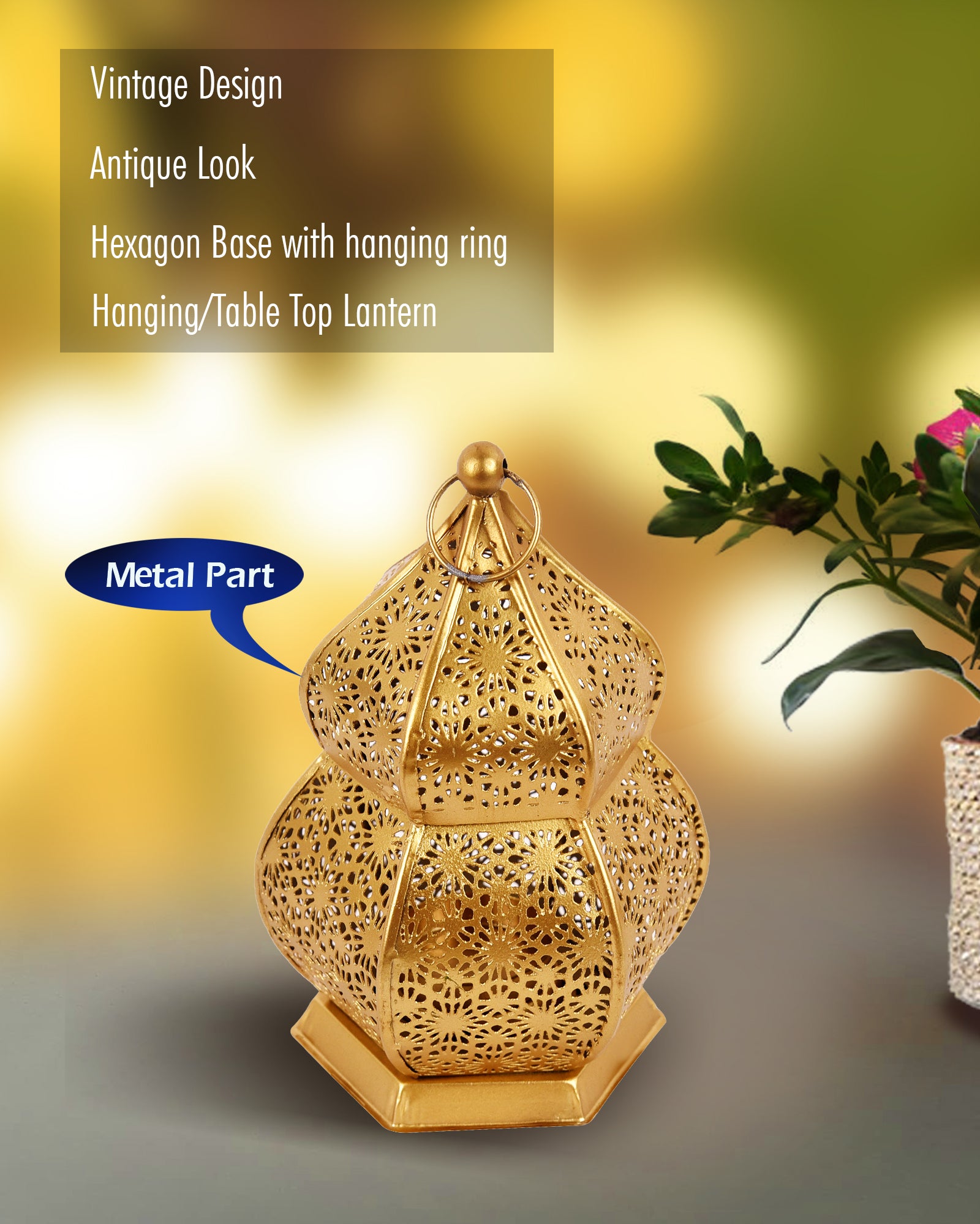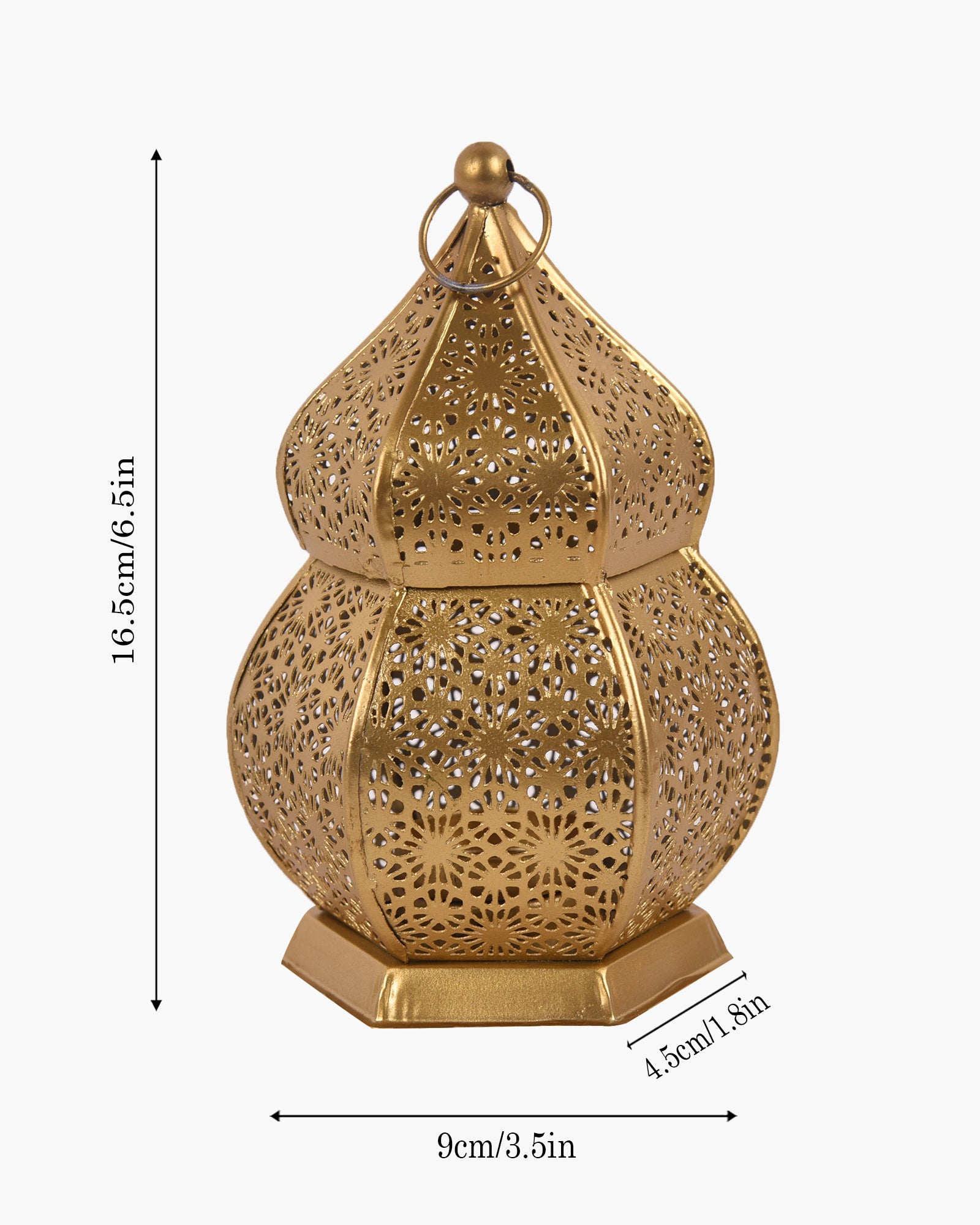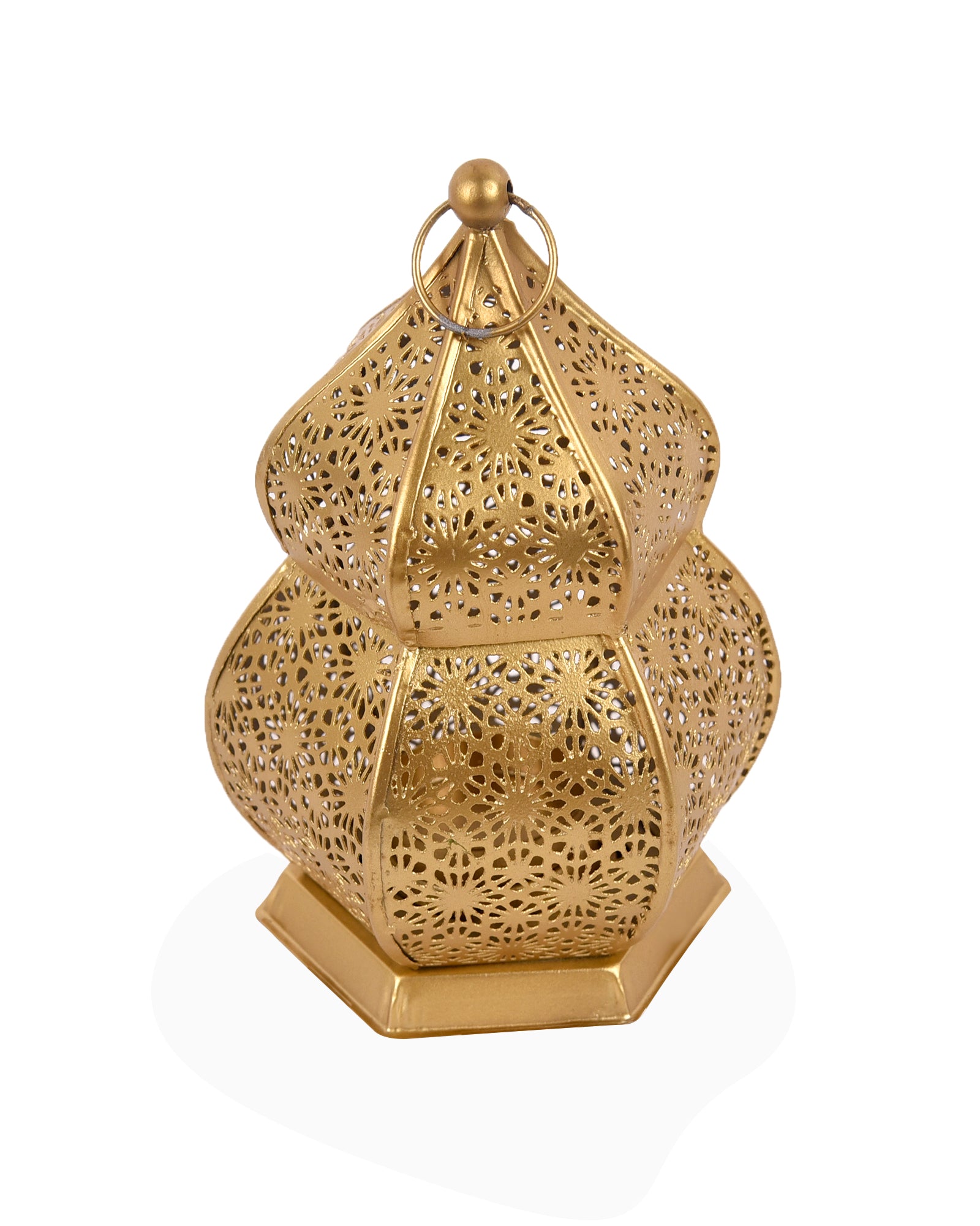 Add warmth to your space with this vintage-style Moroccan candle lantern, crafted from durable metal in a copper finish. Standing 16.5 cm tall and 9 cm wide, it features intricate floral cutouts that cast magical shadows when lit. The hexagonal base ensures stability on tables, while the decorative ring allows easy hanging. Ideal for both indoor and covered outdoor use, this compact candle lantern brings a cozy, ambient glow to living rooms, patios, or dining areas. Blend traditional Moroccan charm with modern elegance in any décor setting.