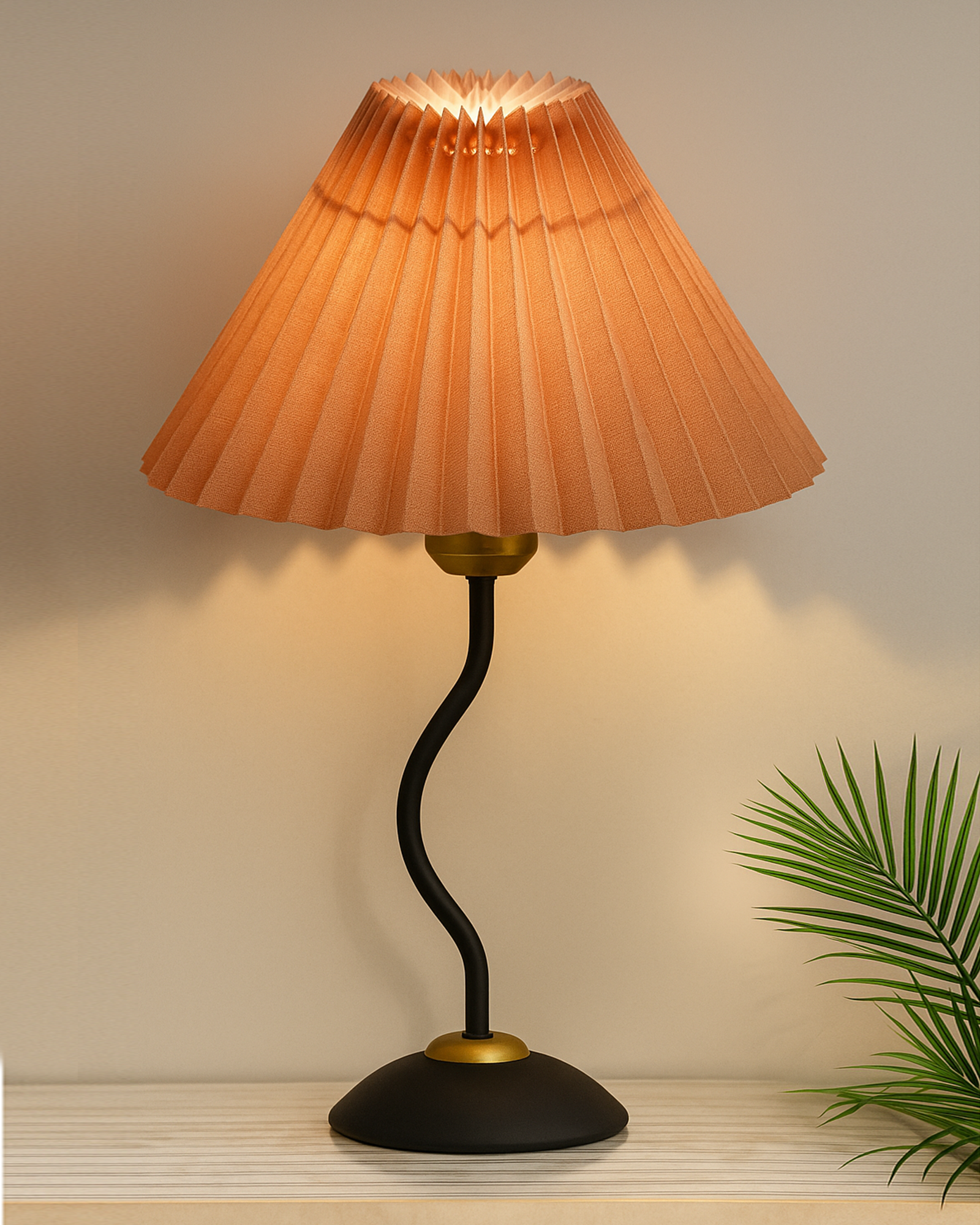 Elevate your space with this elegant table lamp, featuring a warm beige pleated fabric shade and a sleek C-curved metal stand with brass-toned accents. Standing 39.3 cm tall, it offers a striking silhouette and soft ambient lighting. The 25.4 cm shade and sturdy 11.4 cm black base ensure balanced proportions, ideal for bedside tables, desks, or side tables. Easy to assemble with a 5-step guide, it includes an E27 holder (bulb not included) and a two-pin plug with ON/OFF switch. Crafted from quality metal, it adds both style and stability to any room.