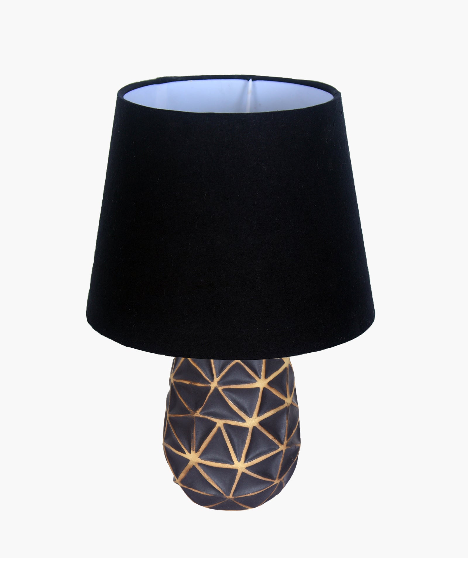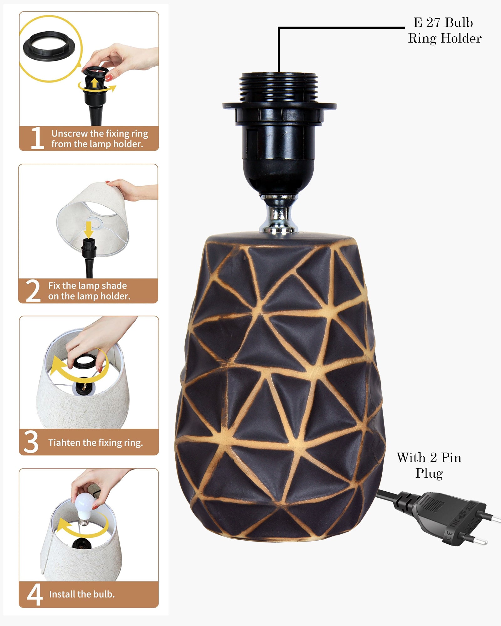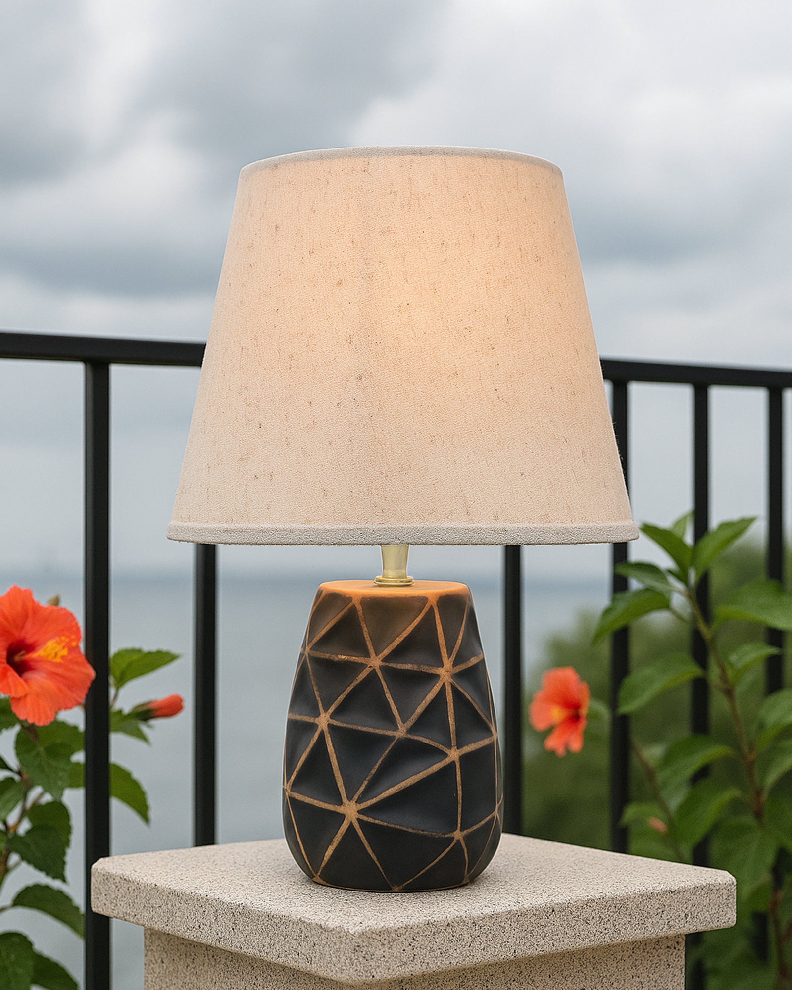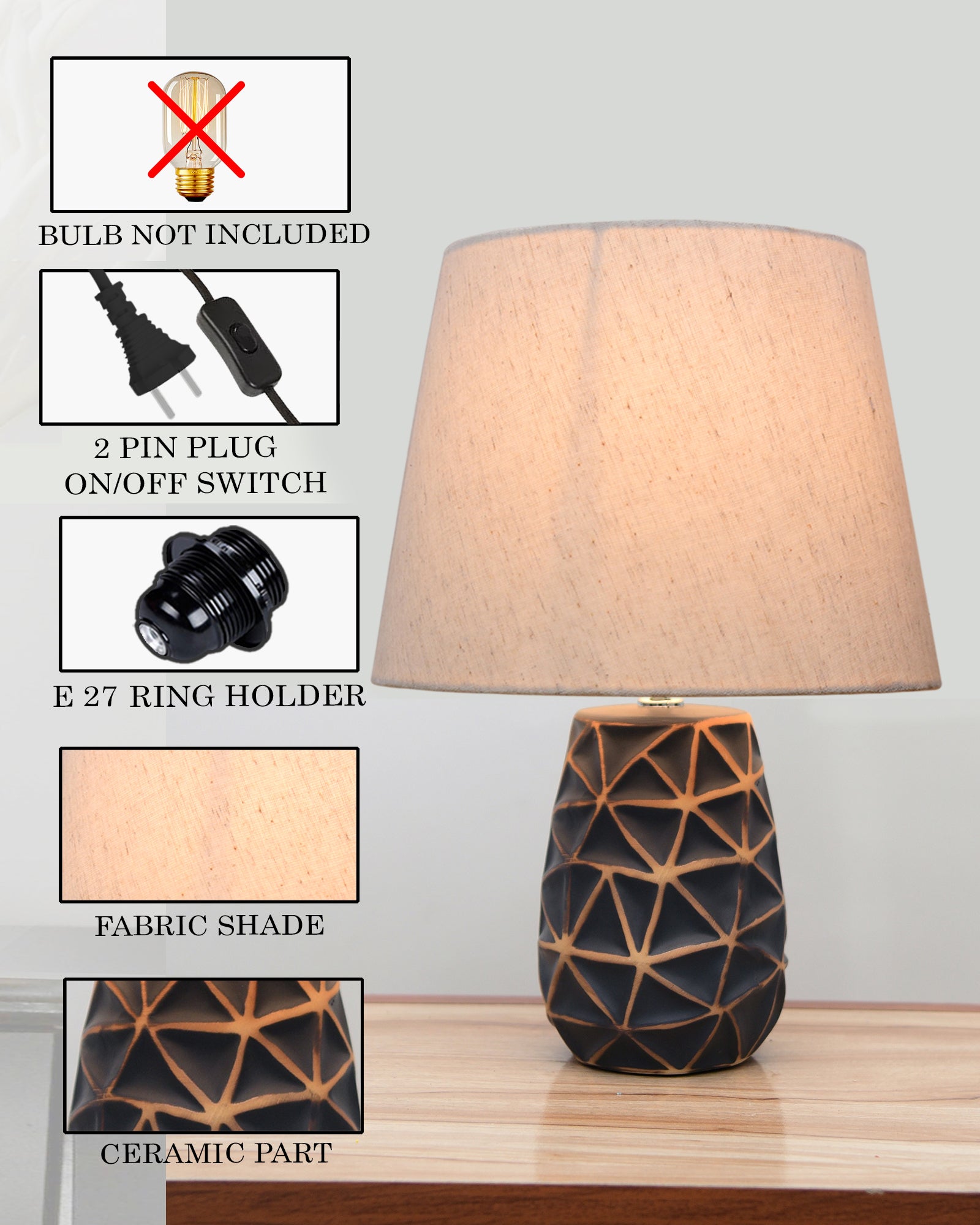Add warmth and style to your home with this rustic ceramic table lamp, featuring a unique geometric carved base in earthy brown tones and a classic beige fabric shade. Its handcrafted texture and modern design make it a versatile accent for bedrooms, living rooms, or study areas. it includes a durable E27 holder, 2-Pin Plug with ON/ OFF Switch, (bulb not included) and supports LED bulbs. The lamp diffuses soft, ambient light, creating a cozy atmosphere while serving as a stylish décor statement. Perfect for those who love modern rustic, bohemian, or farmhouse-inspired interiors, this lamp combines durability with timeless design.