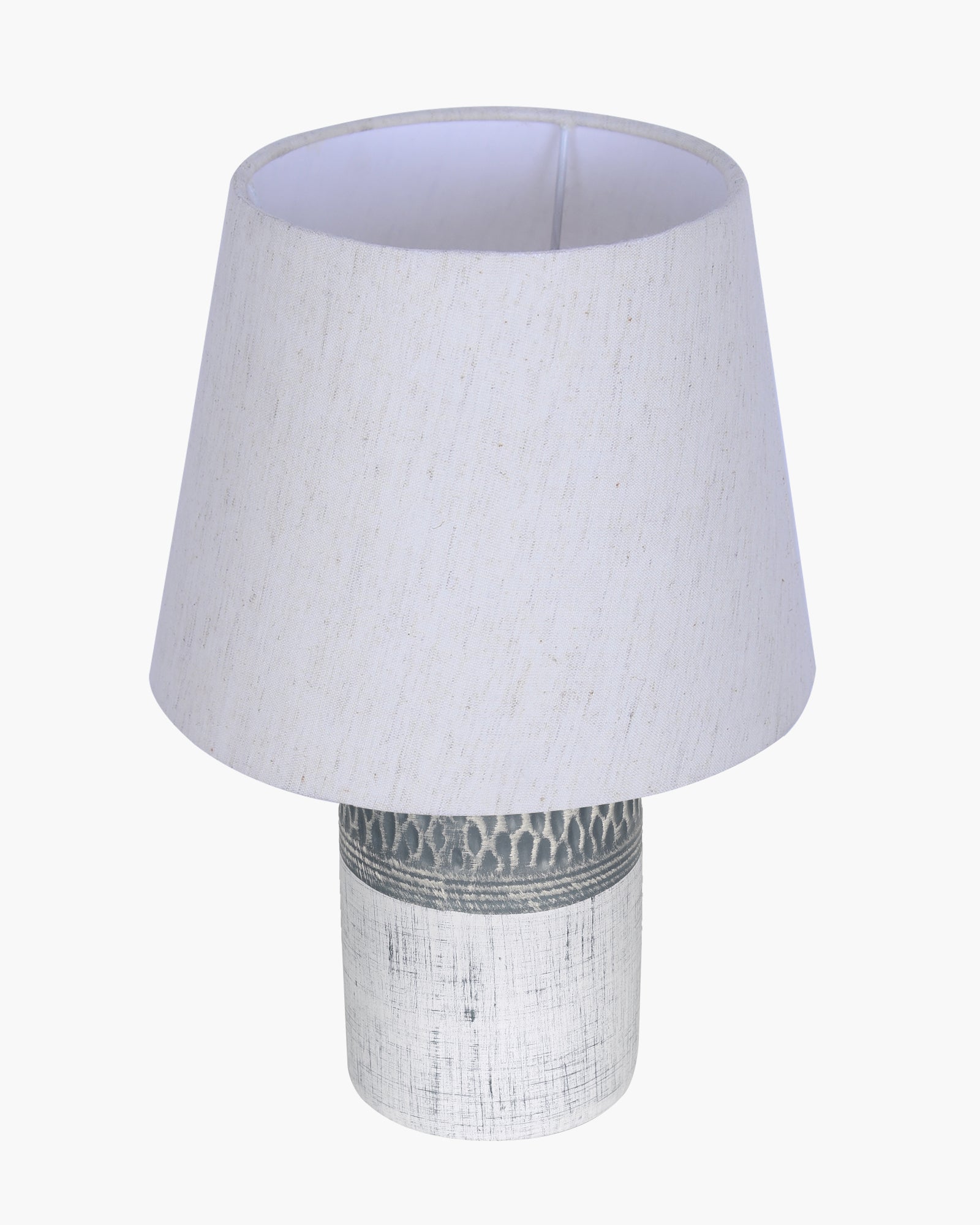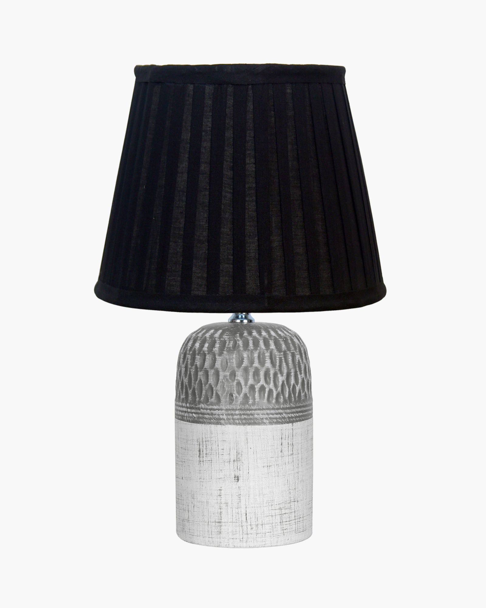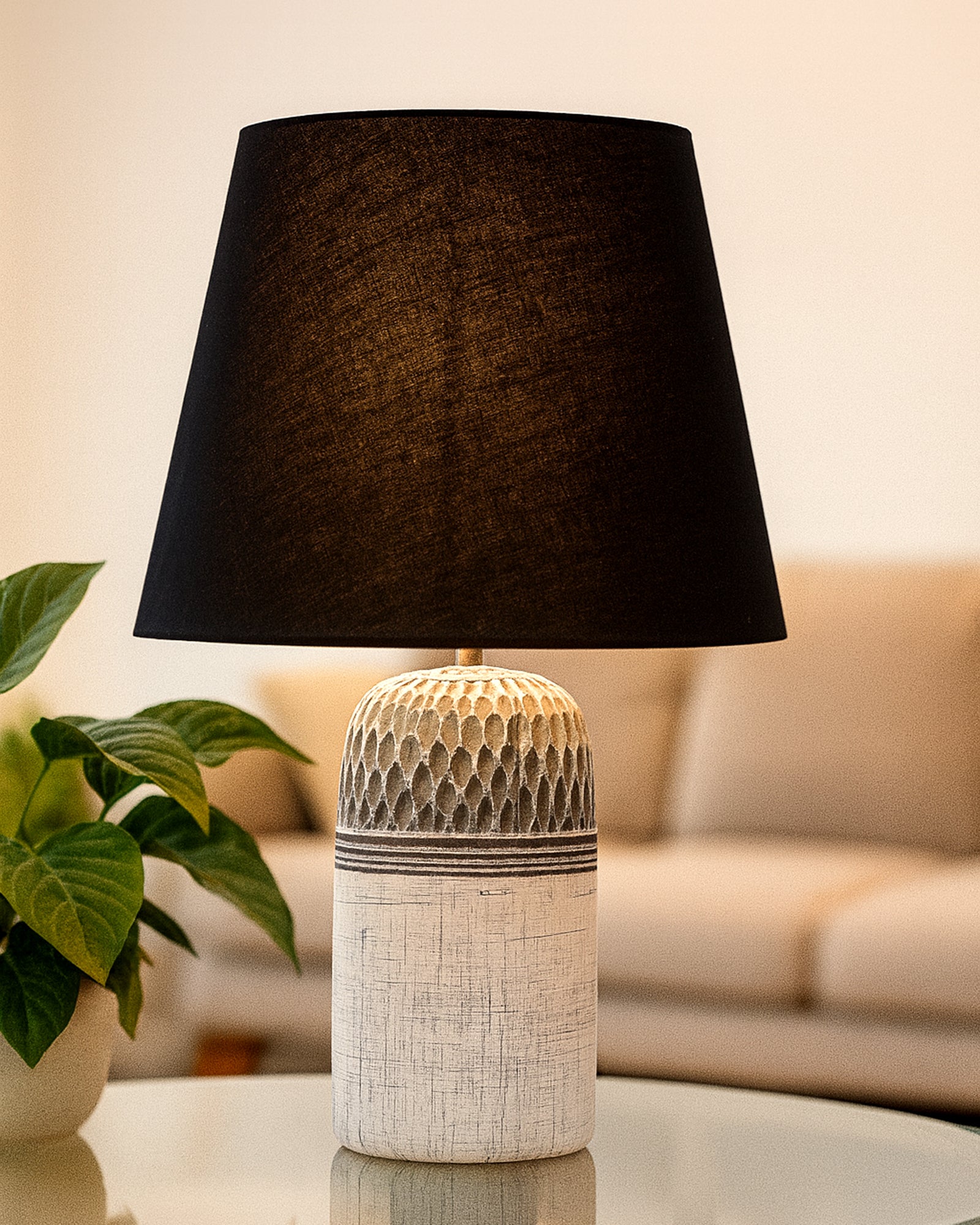 Bring a refined rustic charm to your home with this ceramic table lamp, featuring a handcrafted textured white base with carved detailing and a black fabric shade. The lamp emits a warm, inviting glow that enhances the ambiance of bedrooms, living rooms, or workspaces. it includes a durable E27 holder, 2-Pin Plug with ON/ OFF Switch, (bulb not included) and supports LED bulbs. With its balance of rustic artistry and modern elegance, this lamp serves as both a functional lighting solution and a stylish décor piece. Durable and timeless, it’s the perfect addition to homes with farmhouse, bohemian, or modern rustic interiors.