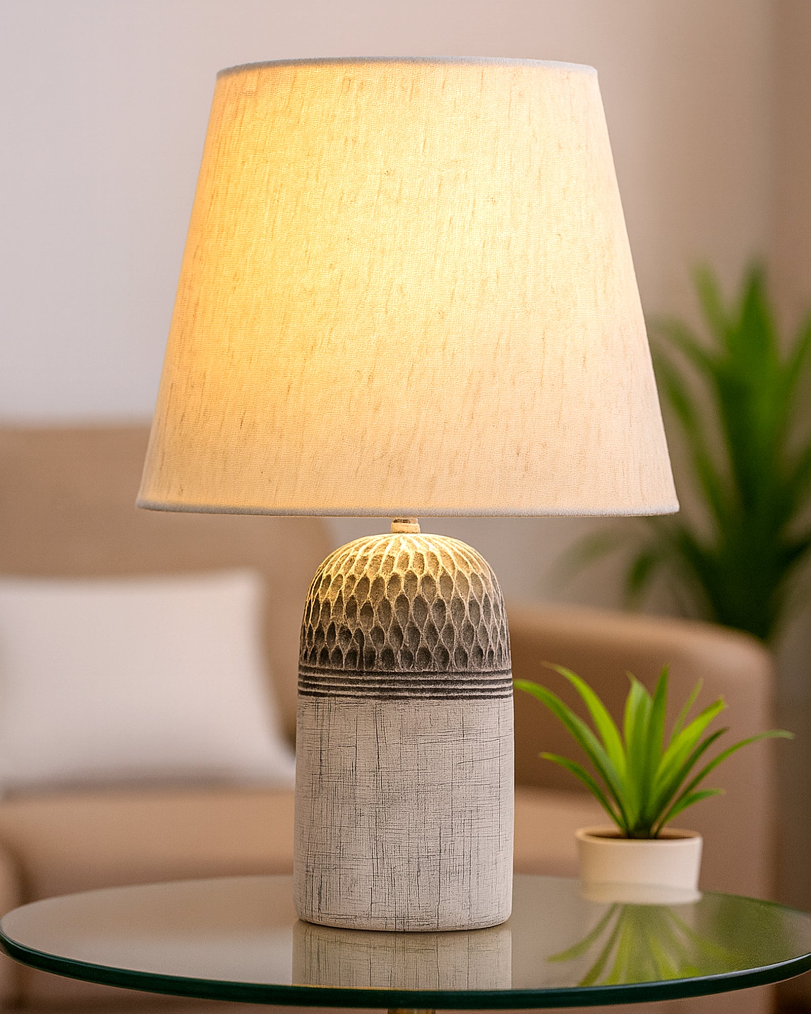 Modern Ceramic Table Lamp with Fabric Shade, Minimal Bedside Lamp for Living Room & Bedroom, Grey Carved Honeycomb Pattern, Khadi Taper