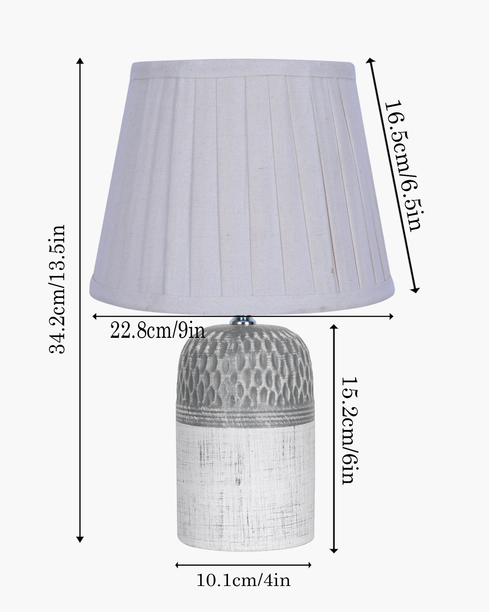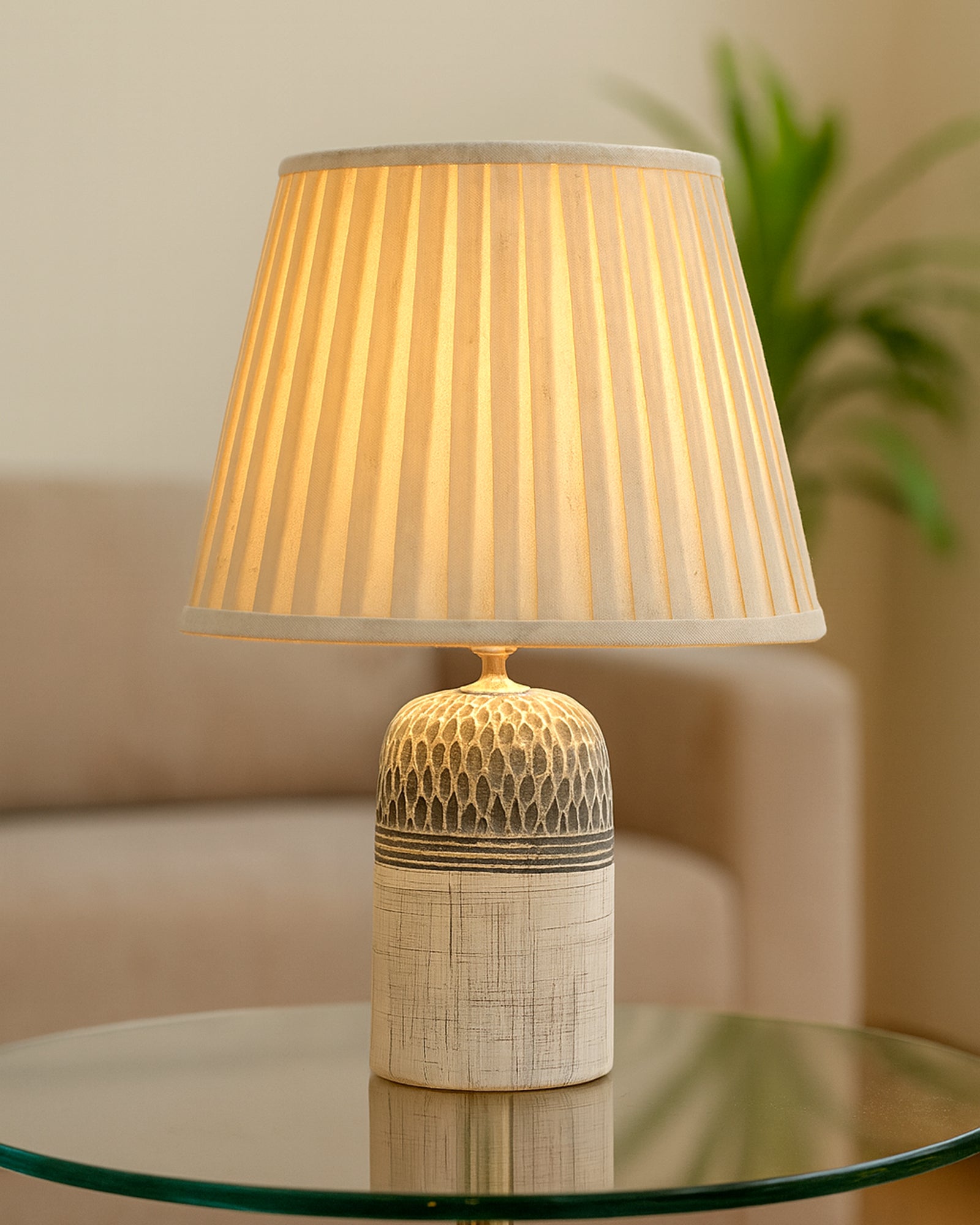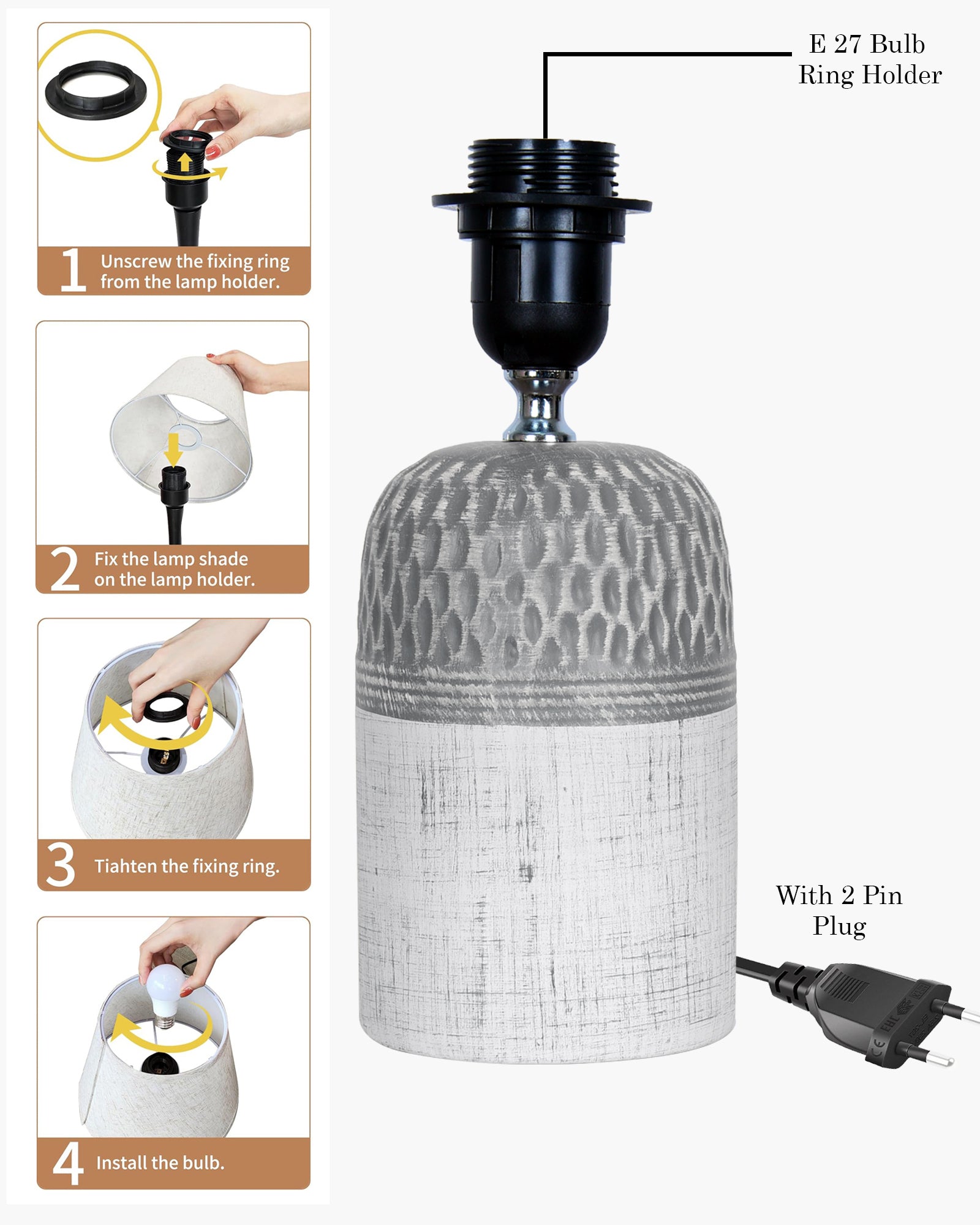 Bring a refined rustic charm to your home with this ceramic table lamp, featuring a handcrafted textured white base with carved detailing and a black fabric shade. The lamp emits a warm, inviting glow that enhances the ambiance of bedrooms, living rooms, or workspaces. it includes a durable E27 holder, 2-Pin Plug with ON/ OFF Switch, (bulb not included) and supports LED bulbs. With its balance of rustic artistry and modern elegance, this lamp serves as both a functional lighting solution and a stylish décor piece. Durable and timeless, it’s the perfect addition to homes with farmhouse, bohemian, or modern rustic interiors.