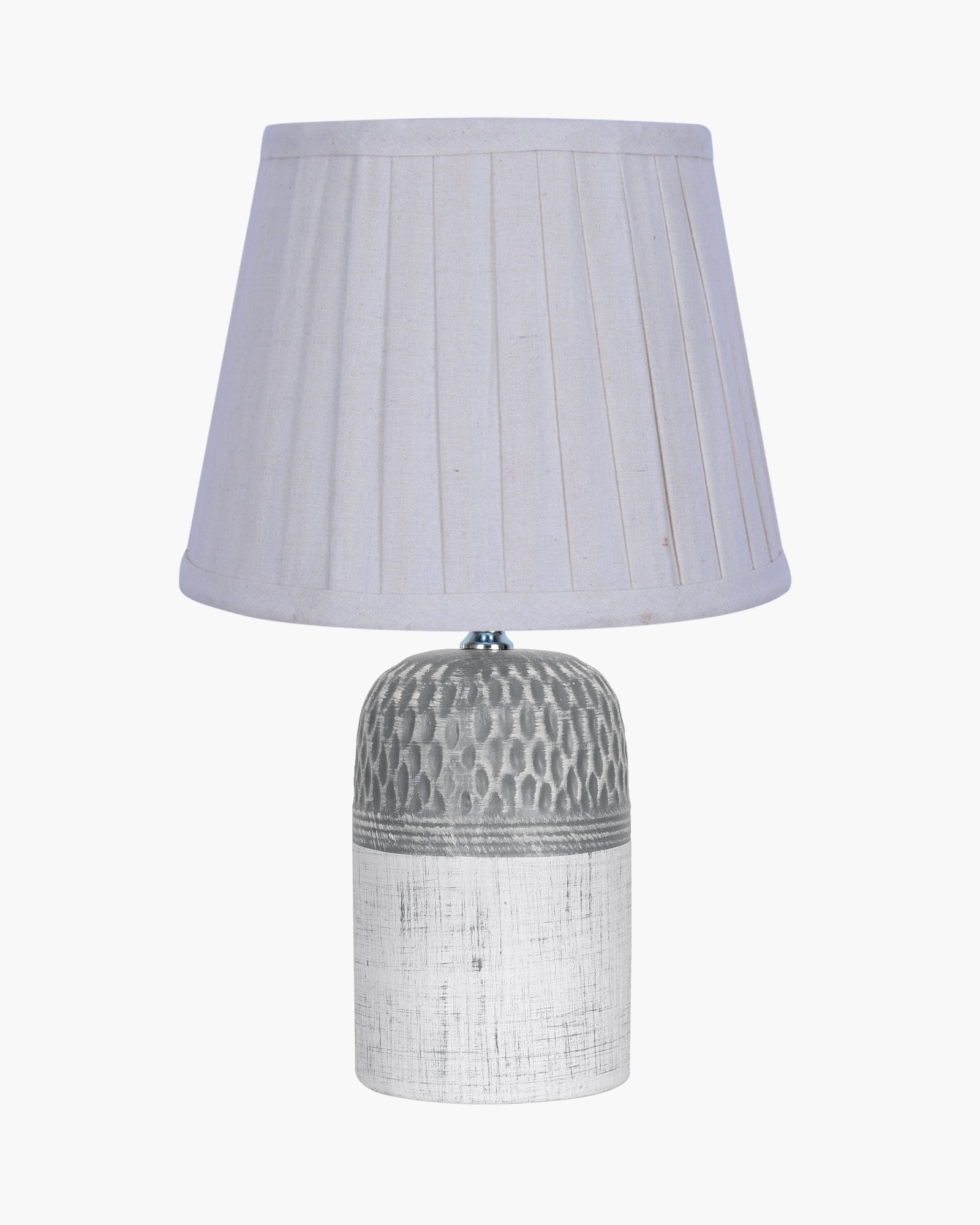 Modern Ceramic Table Lamp with Fabric Shade, Minimal Bedside Lamp for Living Room & Bedroom, Grey Carved Honeycomb Pattern, Khadi Taper