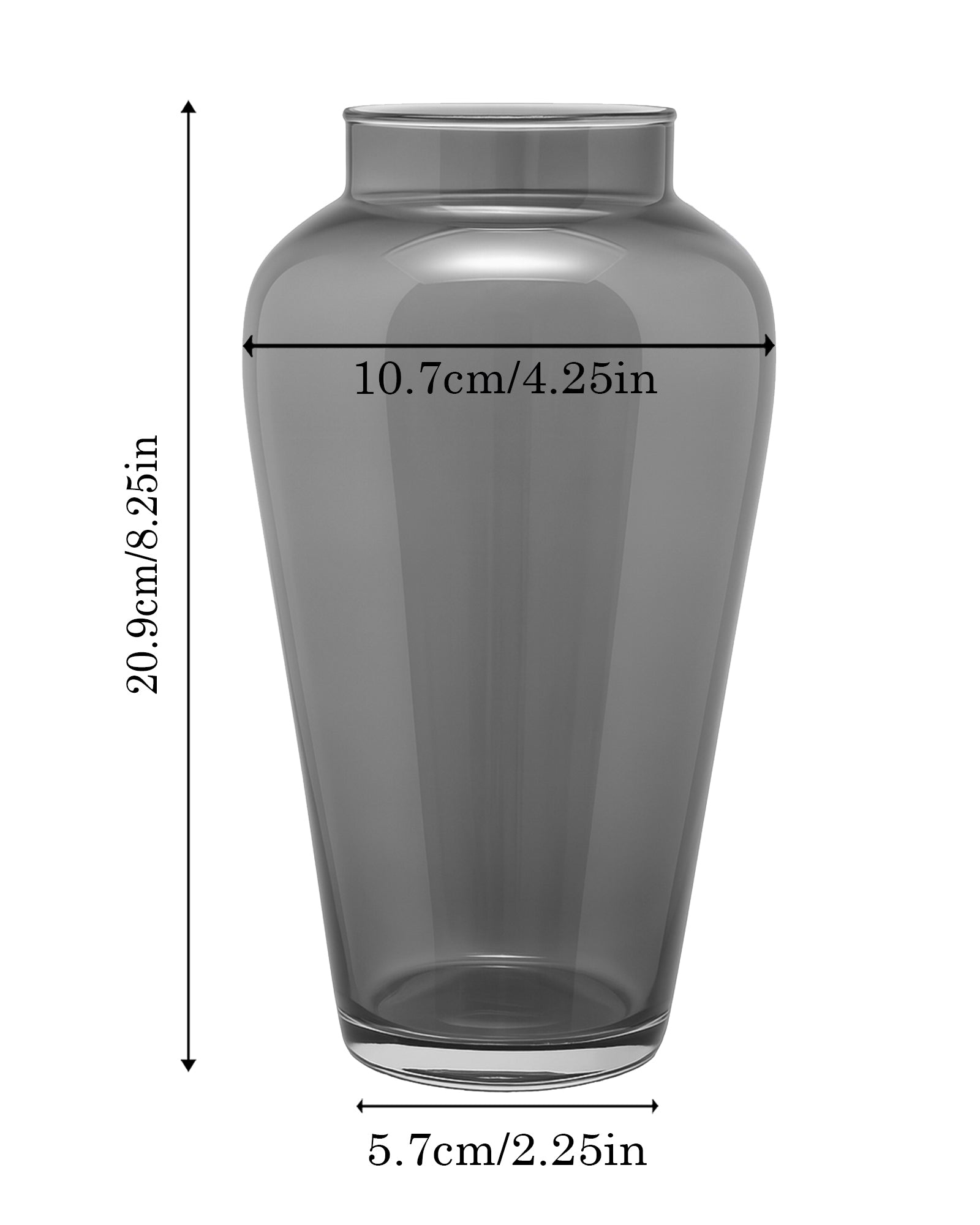 Add modern elegance to your space with this smoke grey glass vase. Standing 20.9 cm tall with a classic urn silhouette, it features a 10.7 cm width and a 5.7 cm base. The smoky tint adds a sleek, contemporary touch while remaining transparent—ideal for fresh flowers, dried stems, or branches. Its neutral tone complements any décor, and the smooth, polished finish offers timeless appeal. wedding gift for friend, vases living room, vases, vase home decor, vase, room, table showpiece, decoration items, small showpieces, showpiece decor unique, home, gift, bedroom, show piece case decorative Flower Vase.