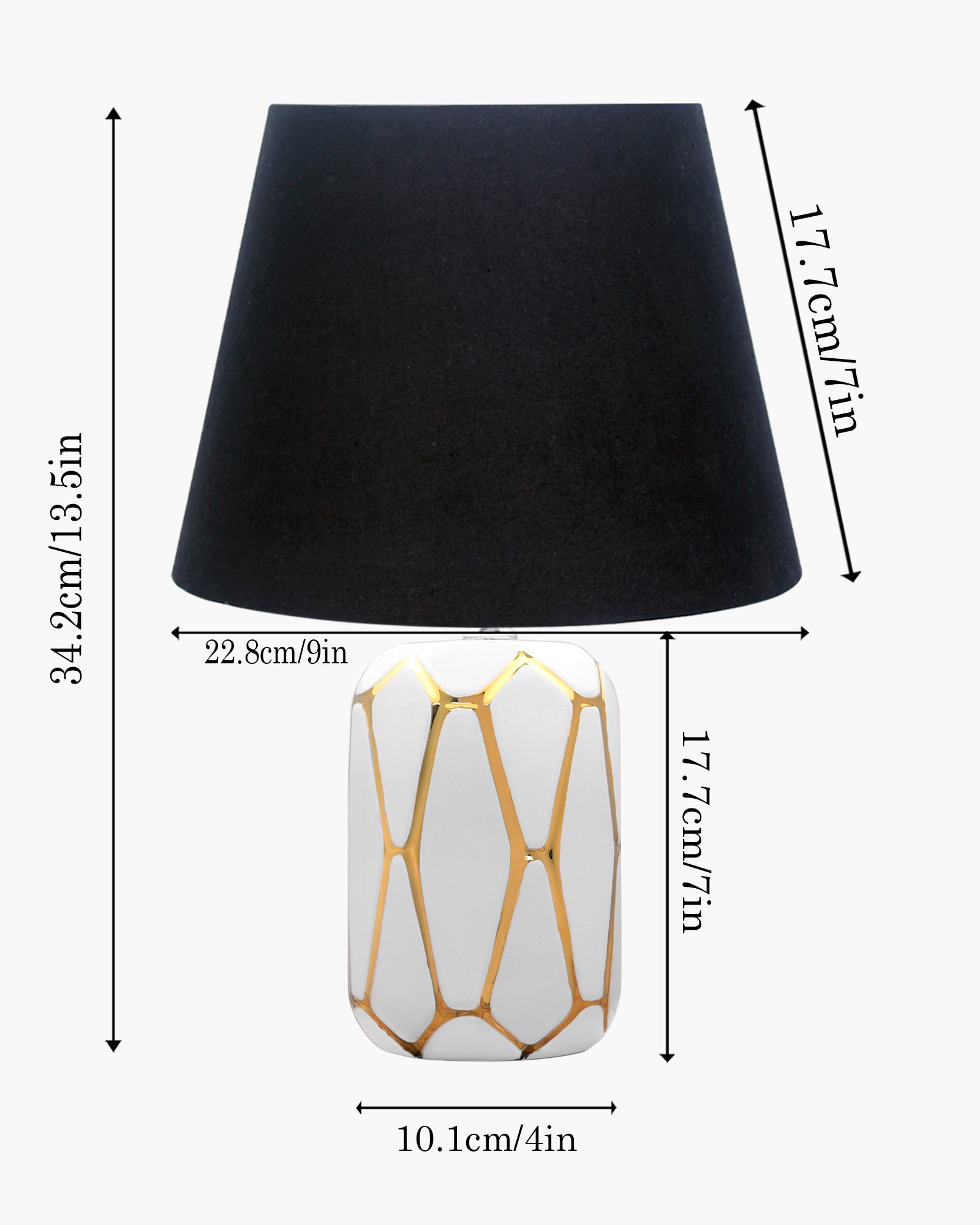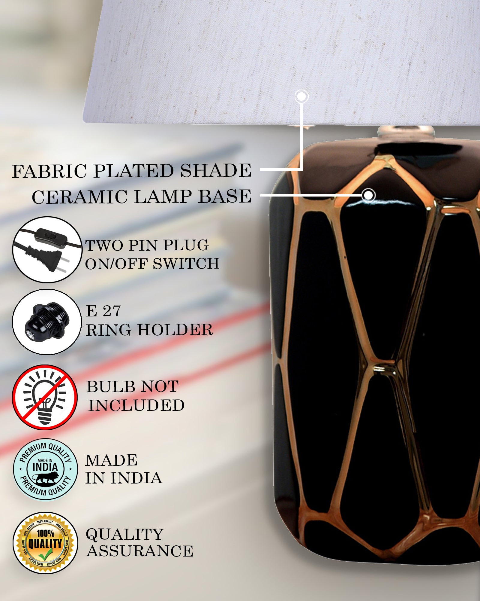 Bring a touch of sophistication to your interiors with this modern White ceramic table lamp, featuring a bold gold geometric base paired with a classic White tapered fabric shade. it includes a durable E27 holder, 2-Pin Plug with ON/ OFF Switch, (bulb not included) and supports LED bulbs. Designed to cast a warm, inviting glow, this lamp is perfect for bedrooms, living rooms, or office spaces. Its durable ceramic construction and premium finish make it not just a source of light but also a statement décor piece that elevates any modern or contemporary setting.
