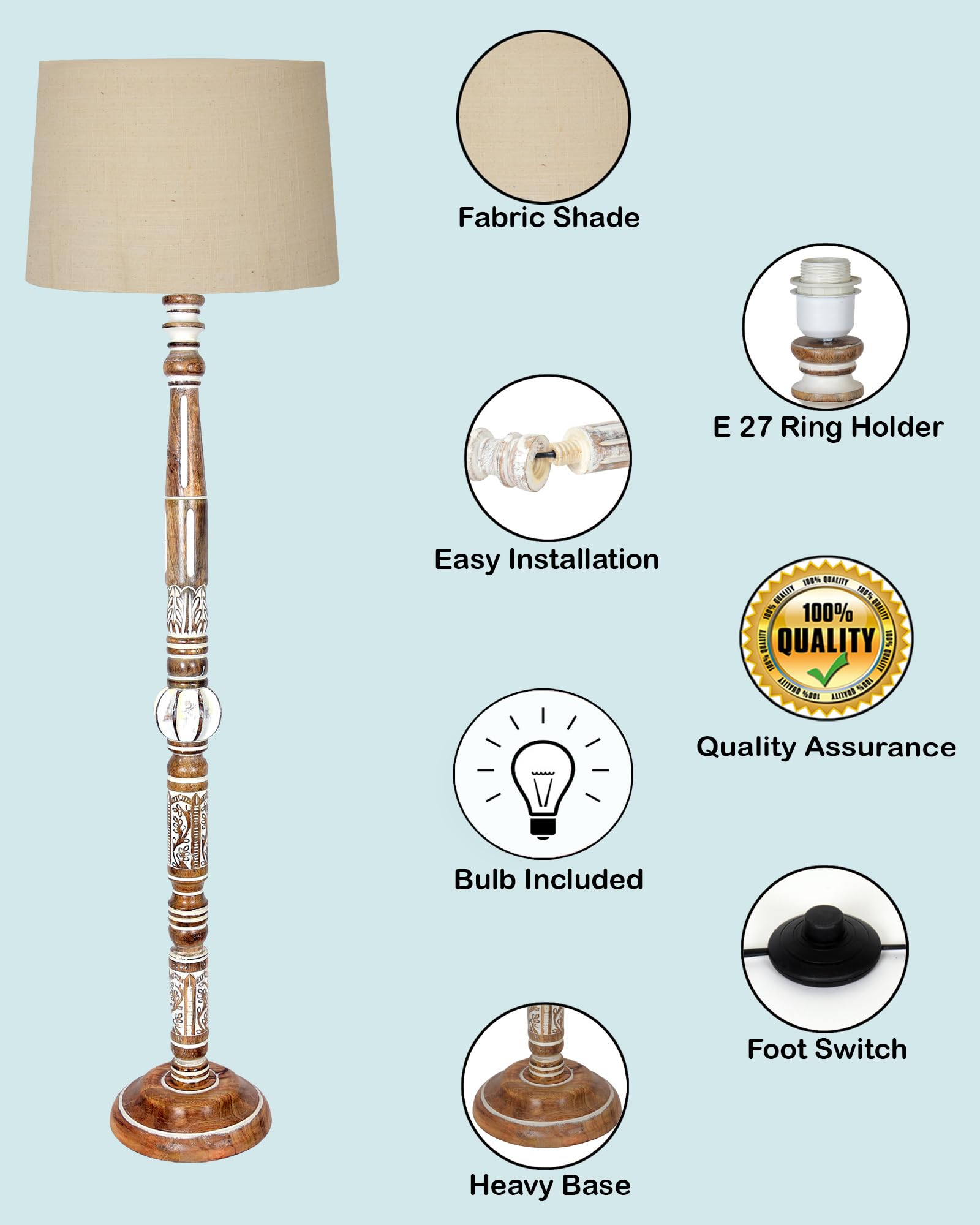 Royal Carving Antique white finish wooden floor lamp with Beige Fabric Lamp Shade