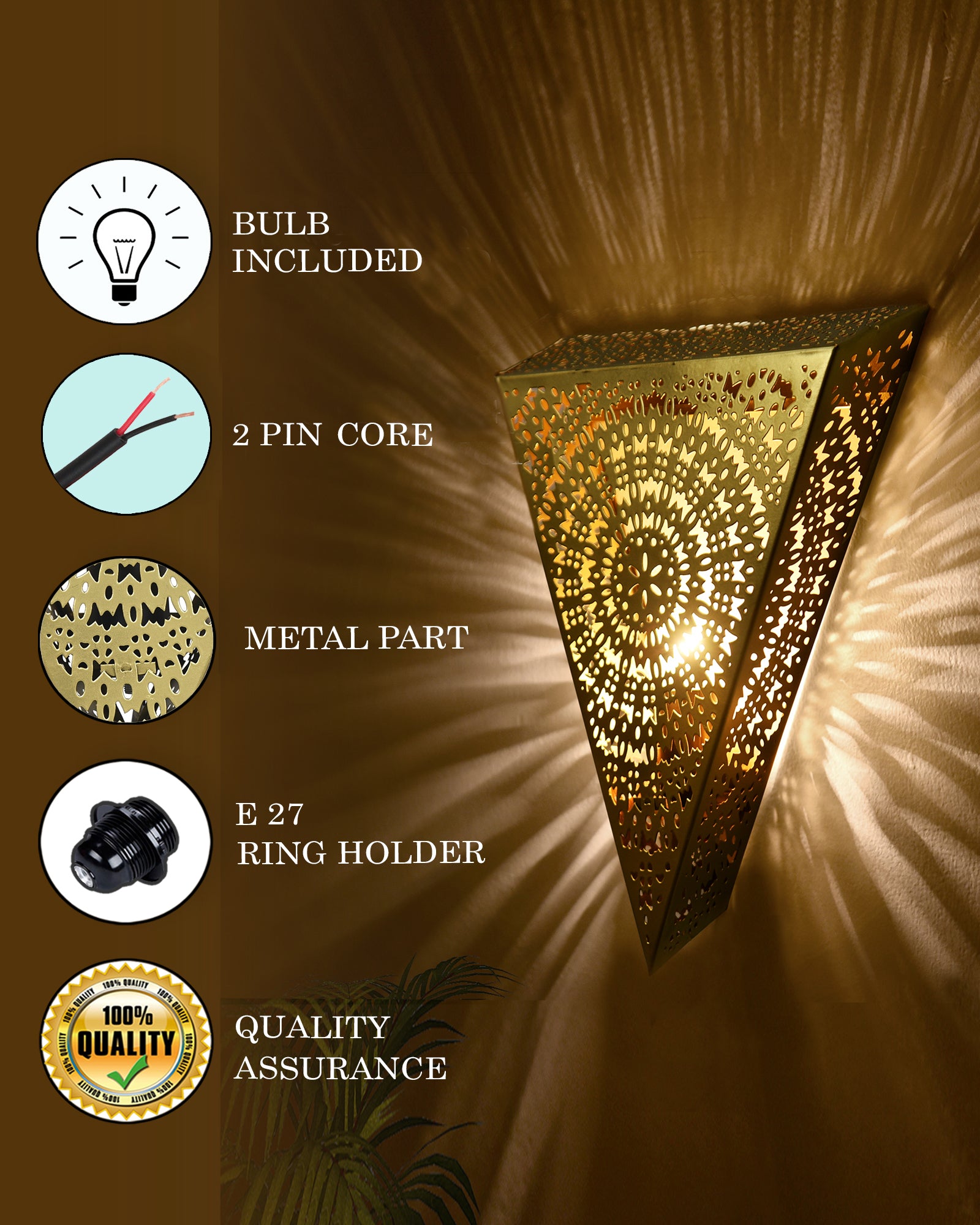 | Elevate your space with this exquisite gold metal corner wall lamp, blending artistry with illumination. Featuring an intricate mandala-inspired cutwork design, it casts mesmerizing shadows, adding depth and ambiance. The metallic gold finish complements both modern and traditional décor, while energy-efficient lighting enhances its dramatic visual effect. Perfect for living rooms, corridors, or bedrooms, this elegant fixture doubles as a statement piece and functional lighting, bringing warmth and sophistication to any interior, wall lamp, wall light, wall mounted, light fixture, wall sconces, home decor, decorative items, light, lights wall decorative lamps room living items decor, decorative sconces, home fixture, wall light mounted, light, retro lamp, cafe bedside for-bedroom, light, mount lamp, portable décor, wall lamp light, vintage wall lamps, Industrial wall lights decoration. |